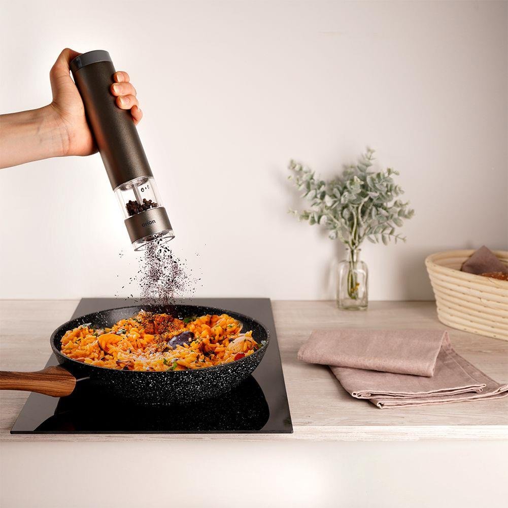 Elektryczny młynek do pieprzu, soli i innych przypraw wykonany z trwałego aluminium w grafitowym kolorze to połączenie nowoczesnego designu i wygody użytkowania. Wyposażony w ceramiczny mechanizm mielący oraz możliwość regulacji grubości mielenia, pozwala doprawiać potrawy świeżo zmielonymi przyprawami w sposób szybki i bez wysiłku. Obsługa jedną ręką, stylowa forma i praktyczne funkcje sprawiają, że młynek idealnie sprawdzi się zarówno w domu, jak i w profesjonalnej kuchni.