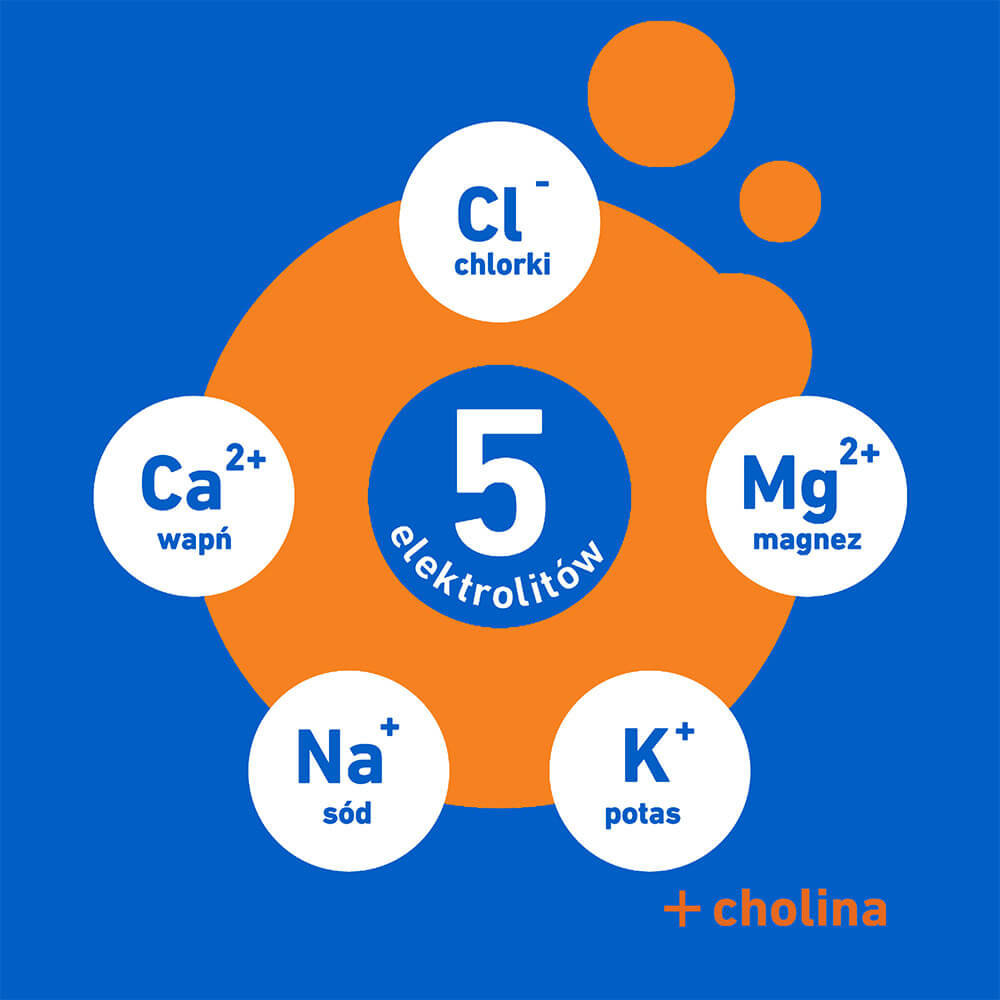 Składniki 1 tabletka % RWS* 3 tabletki % RWS* Potas 300 mg 15% 900 mg 45% Magnez 75 mg 20% 225 mg 60% Wapń 50 mg 6% 150 mg 18% Sód 263 mg --- 789 mg --- Chlorek 195 mg 24% 585 mg 72% Cholina 30 mg --- 90 mg --- Ryboflawina (witamina B2) 0,64 mg 46% 1,92 mg 138%