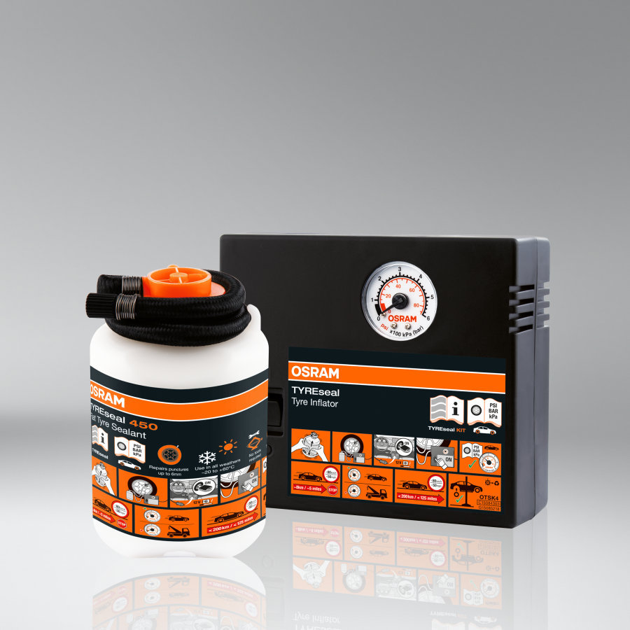 Zestaw do uszczelniania OSRAM TYREseal KIT jest dostarczany z pokrowcem z zapięciem na rzep, dzięki czemu można go przechowywać w bagażniku lub we wnęce przeznaczonej do tego celu w pojeździe.OSRAM TYREseal 450 może być używany jako zamiennik fabrycznego wyposażenia uszczelniającego od producenta. Ponieważ większość uszczelniaczy opon należy wymieniać co 5 lat, w tym te dostarczane fabrycznie w samochodzie, butelka zamienna OSRAM TYREseal 450 to idealny sposób na wymianę uszczelniacza do opon w samochodzie po upływie terminu ważności.OSRAM TYREseal 450 i OSRAM TYREseal KIT to uszczelniacze do opon firmy OSRAM, które wykorzystują technologię żelu cząsteczkowego do uszczelniania przebić opon i są produkowane zgodnie ze standardem OE producentów samochodów. Dostępne jako zestaw, to jest OSRAM TYREseal KIT, z żelem uszczelniającym, kompresorem i pokrowcem albo jako OSRAM TYREseal 450, to jest jako butelka żelu uszczelniającego.