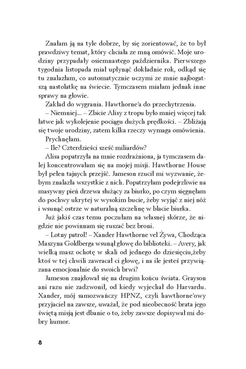 Avery Kylie Grambs odziedziczyła majątek po zmarłym miliarderze Tobiasie Hawthornie. Warunkiem przejęcia przez nią kontroli nad fortuną było zamieszkanie na rok w Hawthorne House. Do końca zostało jej jeszcze kilka tygodni, tymczasem paparazzi bacznie obserwują każdy jej krok, presja finansowa staje się coraz bardziej odczuwalna, a niebezpieczeństwa są codziennością. Jedyną pomoc w przebrnięciu przez zawiłości nowej sytuacji życiowej stanowią dla Avery bracia Hawthorne’owie. Ich losy są ze sobą nierozerwalnie splecione. Avery zna ich najskrytsze sekrety, oni zaś znają ją na wskroś.