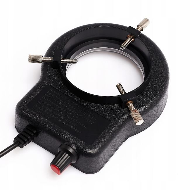Źródło światła mikroskopu z diodami LED. Światło pierścieniowe 48x LED Jego wymiary montażowe wynoszą do 60 mm Średnica pierścienia ma odpowiednio 60mm wewnątrz i 95 mm od zewnętrznej średnicy i działa z zasilaniem napięciem szerokopasmowym od 100 V do 240 V. Oświetlenie z możliwością regulacji natężenia.