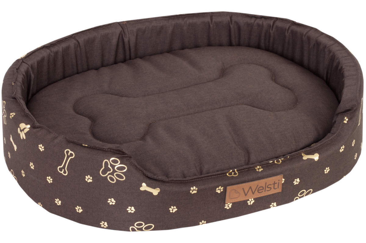 | Nazwa: | Legowisko dla psa, posłanie dla psa, owalne Welsti brązowy złote kości i łapki XL 80x67 dla średniego psa wodoodporne |