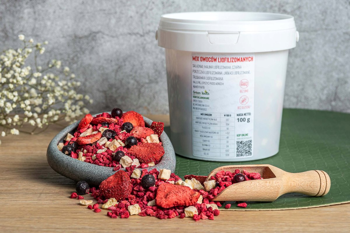 Nasze wiaderko wypełnione jest starannie wyselekcjonowaną mieszanką liofilizowanych owoców, która łączy w sobie zdrowie i wygodę. W skład tej mieszanki wchodzą: maliny w postaci grysu, całe czarne porzeczki, jabłka w kostkach oraz truskawki w plasterkach. Liofilizacja, czyli suszenie przez sublimację, pozwala zachować większość wartości odżywczych owoców oraz ich naturalny kolor i aromat bez dodatku konserwantów.