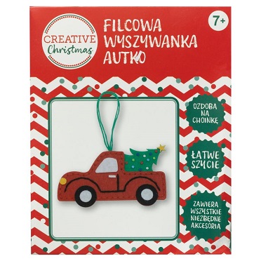 Ozdoba filc wyszywanka - auto Zestaw zawiera: kształty filcu bezpieczną igłę z tworzywa nici instrukcję wymiary opakowania: 150 x 120 x 50 mm Boże Narodzenie to wyjątkowy czas w