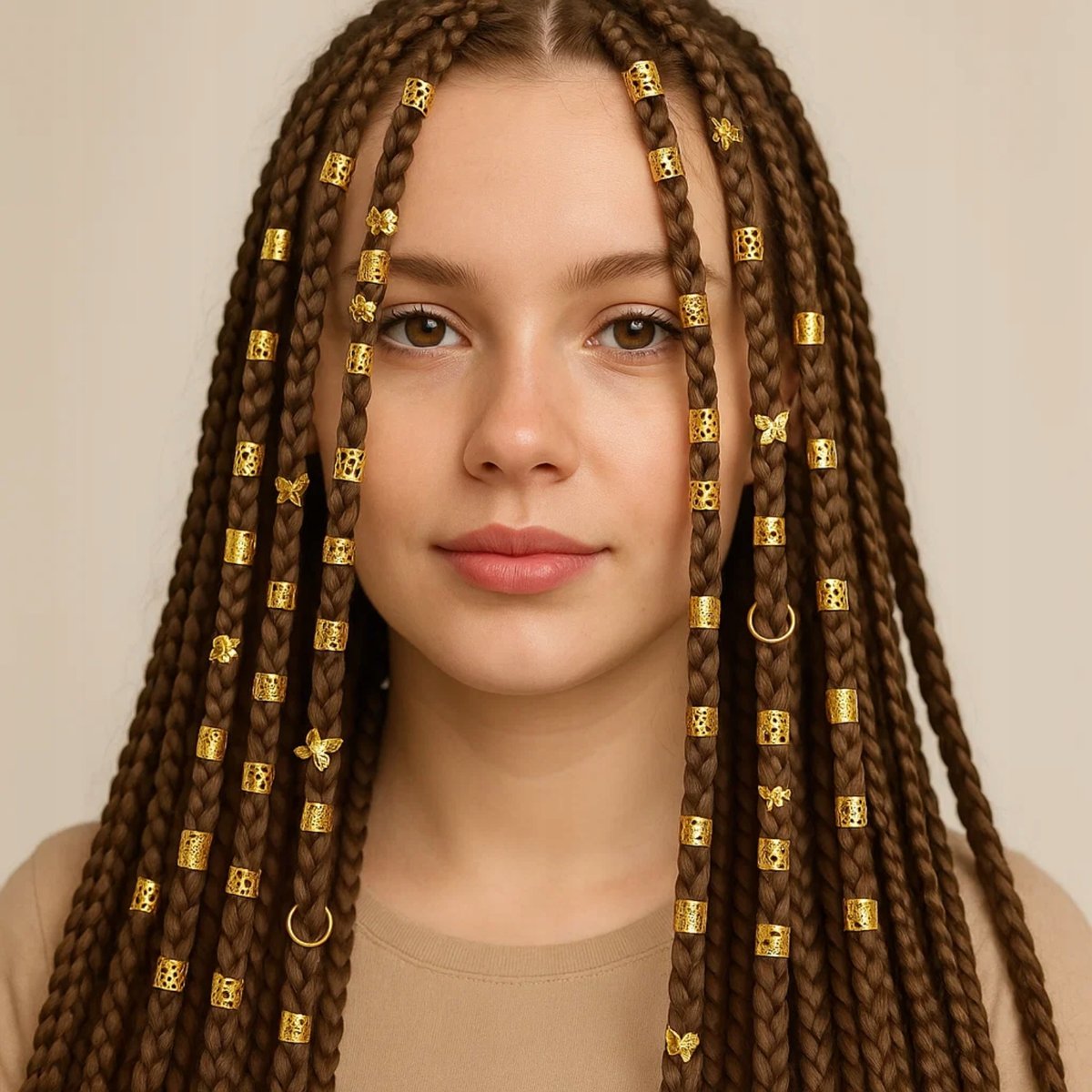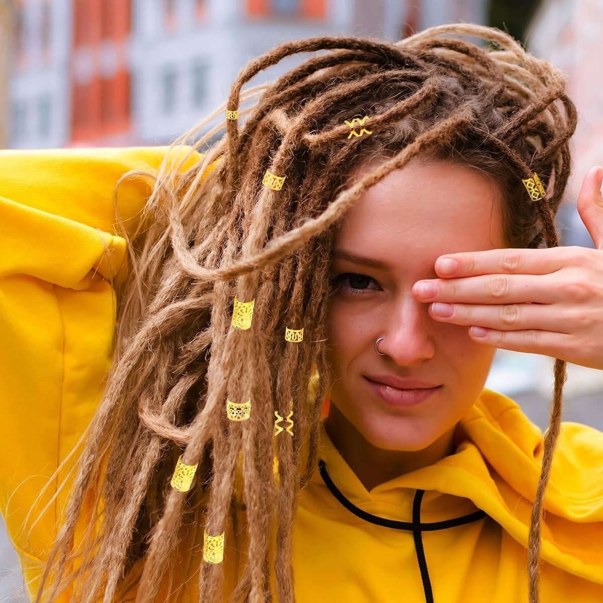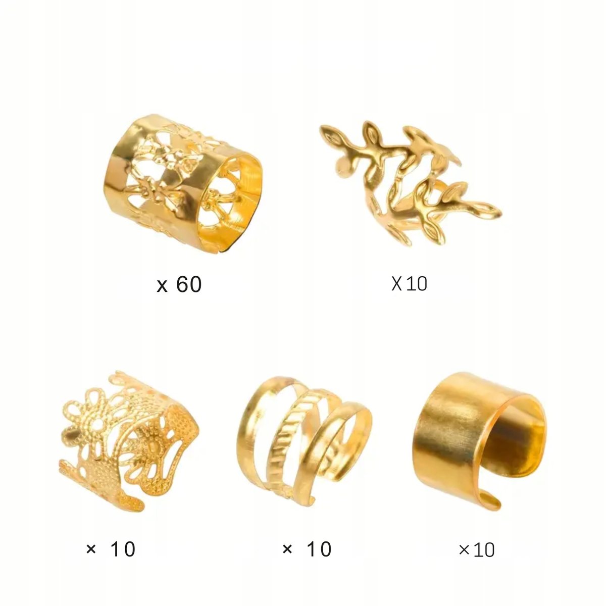 Nadaj swoim fryzurom wyjątkowego stylu! Ten zestaw złotych pierścieni i klipsów do włosów sprawi, że Twoje warkoczyki, dredy lub loki będą wyglądały olśniewająco! ?
