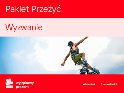 Szukasz oryginalnego prezentu dla niej lub dla niego, ale nie do końca wiesz, na co się zdecydować? Boisz się, że Twój prezent będzie nieudany? Postaw na Pakiet Przeżyć Wyzwanie, czyli zbiór najlepszych prezentów z różnych kategorii, spośród których osoba obdarowana wybierze jedno, które zrealizuje. W ten sposób wręczasz przyjacielowi lub przyjaciółce gwarancję zadowolenia i spełnienie marzeń - w końcu to bliska Ci osoba zdecyduje, z jakiej atrakcji chce skorzystać! Pakiet Przezyć pasuje na każdą okazję - urodziny, rocznicę ślubu, Dzień Chłopaka lub święta Bożego Narodzenia. Wybierz emocjonujący podarunek, podaruj go bliskiej osobie i ciesz się tym, że pomogłeś spełnić jej lub jego marzenia!