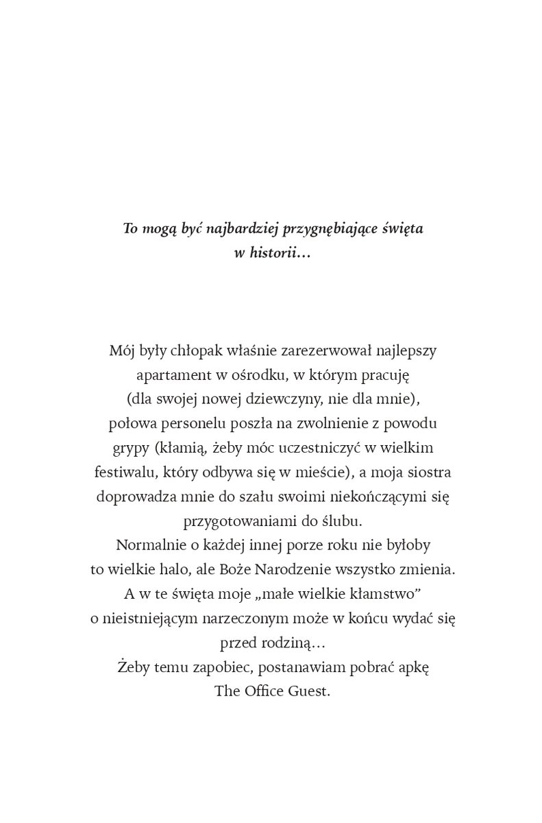 Zwłaszcza że zbliża się rodzinne spotkanie, podczas którego może wyjść na jaw pewne drobne kłamstewko… o narzeczonym, którego nigdy nie miała. W desperacji Georgia korzysta z aplikacji The Office Guest, oferującej wynajem przystojnych „biznesmenów” na rodzinne okazje. Świetny pomysł – do czasu, gdy wybrany mężczyzna odwołuje wizytę, a system automatycznie przydziela jej „jeszcze lepszego zamiennika”.