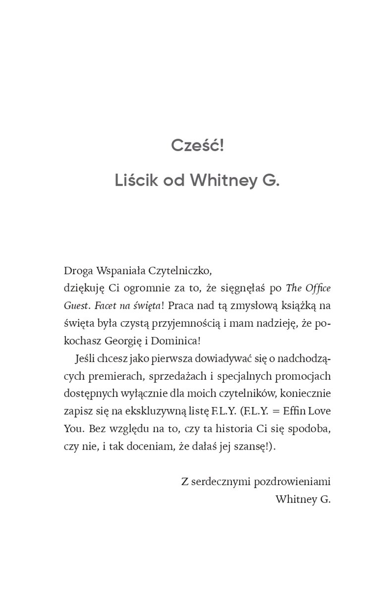Książka zawiera dwa świąteczne opowiadania autorstwa Whitney G.! Podaruj sobie podwójną dawkę świątecznych uniesień. „The Office Guest. Facet na święta” Czy to będą najgorsze ...