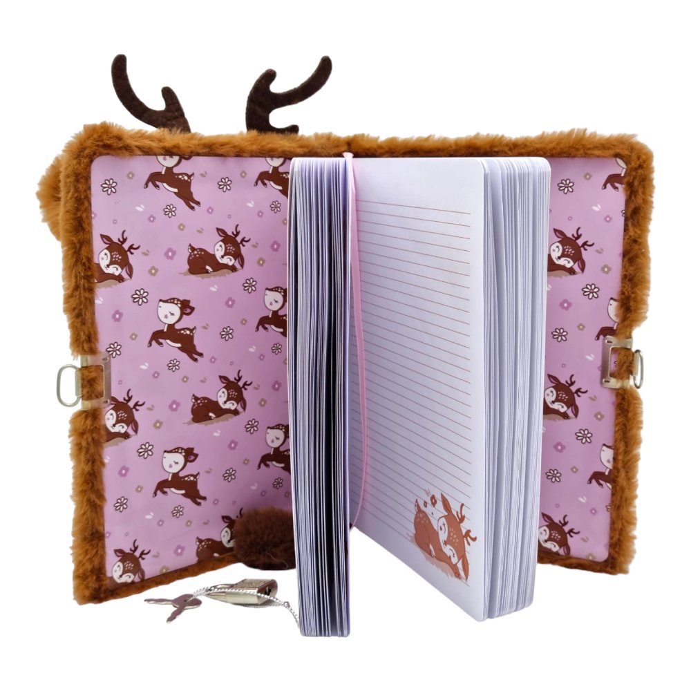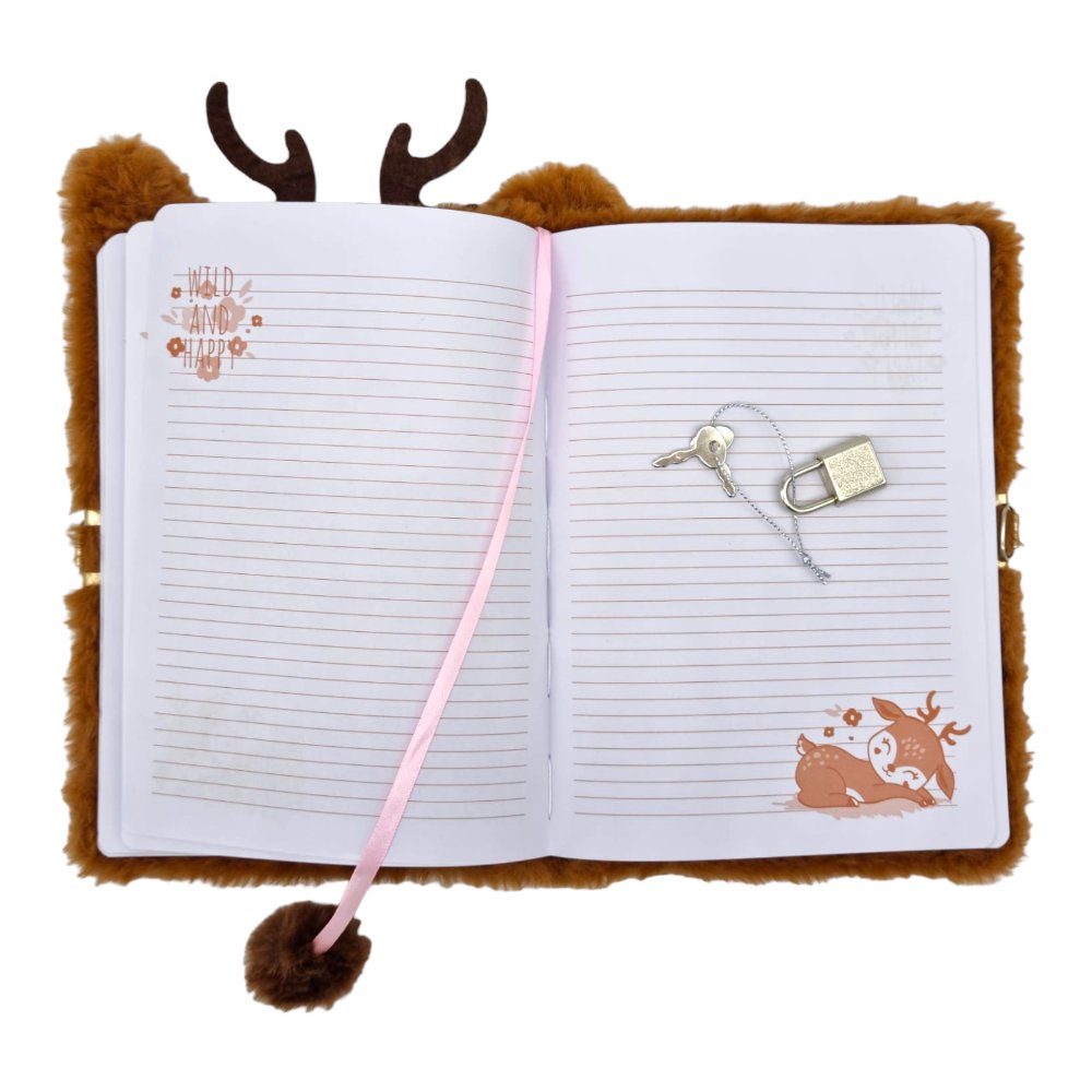 🦌 🌸 Pamiętnik na kłódkę i kluczyk idealny dla każdej dziewczynki do zapisywania dziecięcych sekretów. Pluszowy jelonek z odstającym porożem wykonany z największą starannością o szczegóły. W środku aż 96 kartek do zapisywania tajemnic. W środku ozdobna tasiemka do przekładania kartek zakończona puchatym pomponem. Na każdej stronie ozdobny motyw z jelonkiem. Pluszowy pamiętnik na kłódkę ze wzorem jelonka to piękny i praktyczny prezent, który sprawi wiele radości i pozwoli zachować prywatność swoich najważniejszych myśli i emocji. 🦌 🌸