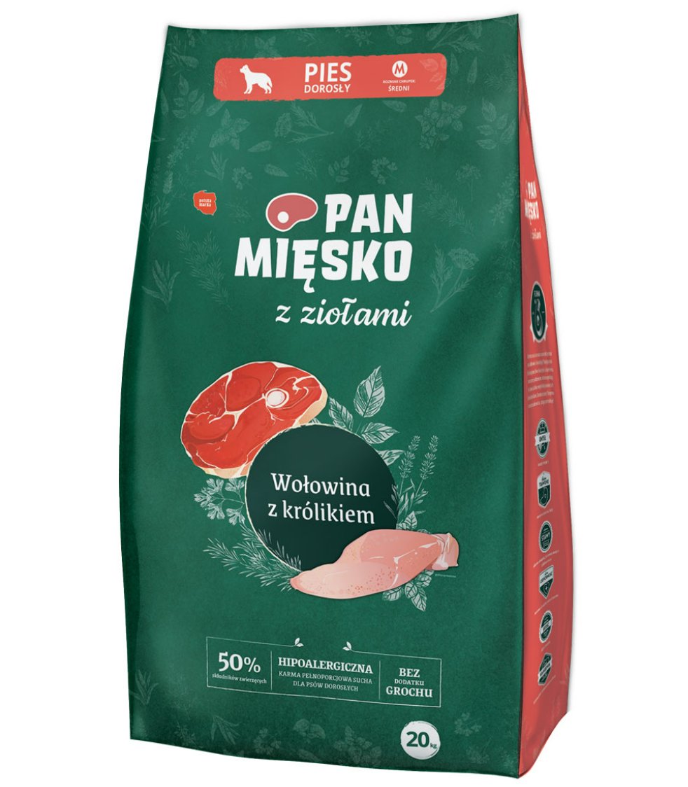 Pan Mięsko z ZIOŁAMI Karma sucha dla psa Wołowina z Królikiem średnie chrupki M - 20kg