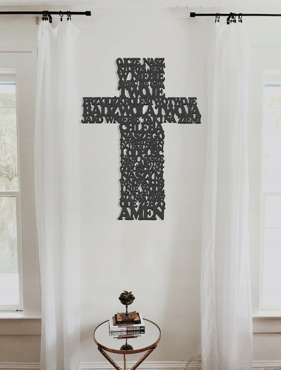 KRZYŻ DREWNIANY NA ŚCIANĘ MODLITWA OJCZE NASZ 40cm CZARNYDrewniany krzyż "Ojcze Nasz" ze sklejki to wyjątkowa ozdoba ścienna, której precyzyjne wykonanie, czytelny napis modlitwy oraz ...