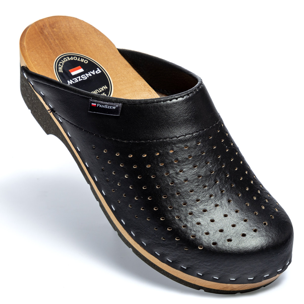 Wierzch drewniaków wykonany z najwyższej jakości skóry naturalnej.