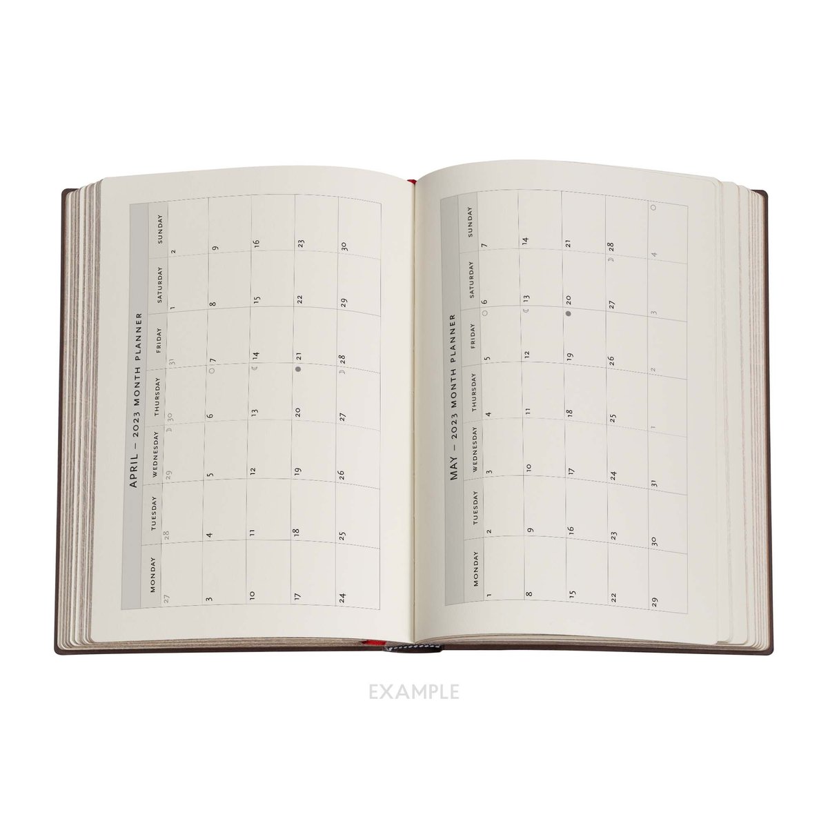 Kalendarz 18-miesięczny (lipiec 2022-grudzień 2023) ekskluzywnej marki Paperblanks. Format Midi typu Horizontal - rozplanowany cały tydzień na 2 stronach. Oprawa twarda. Kalendarium w języku angielskim. W środku miejsce na notatki, roczny planer, oznaczone wybrane święta międzynarodowe, mini kalendarium, międzynarodowe numery telefonów, strefy czasowe, dodatkowe informacje.