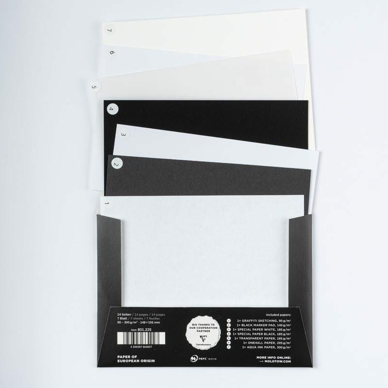 Specjalny zestaw siedmiu papierów oferowanych przez markę Molotow. Siedem kart różnorodnego papieru do markerów akrylowych, wodnych i na bazie alkoholu. Po prostu wypróbuj i sięgnij po swój ulubiony ...