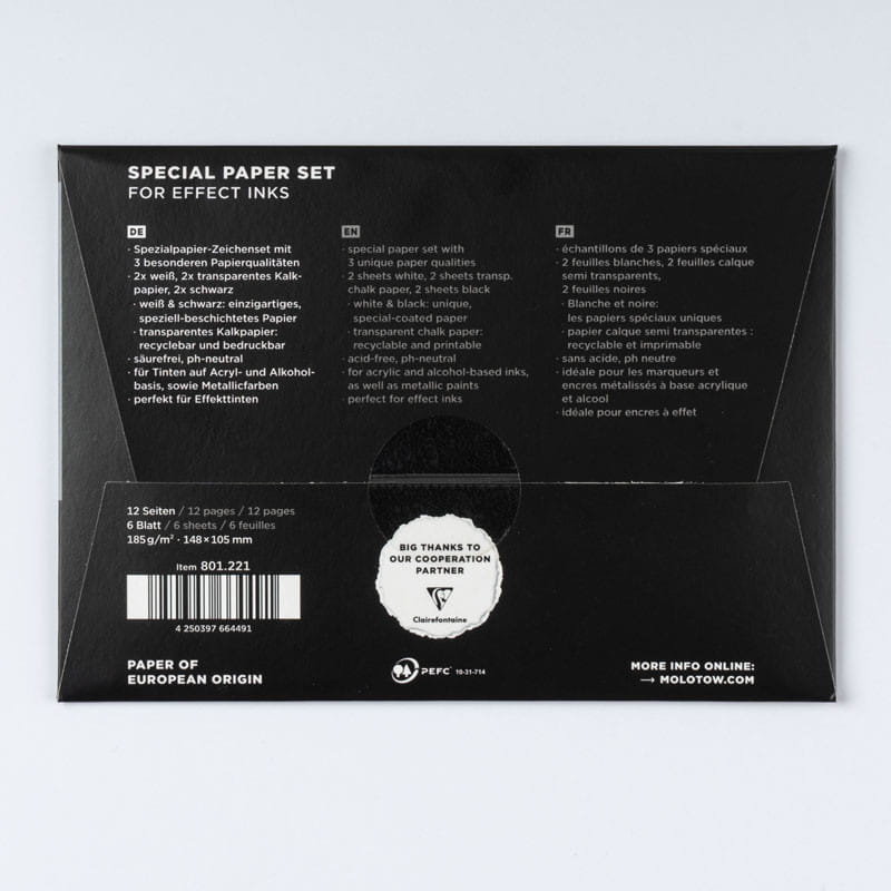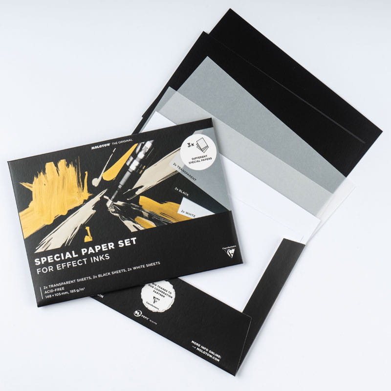 Specjalny zestaw papieru opracowany z myślą o efektowych tusza na bazie alkoholu i akrylu marki Molotow. Sześć sztuk kartek w rozmiarze A6. Idealne do efektów specjalnych, w szczególności pod kolory metaliczne.