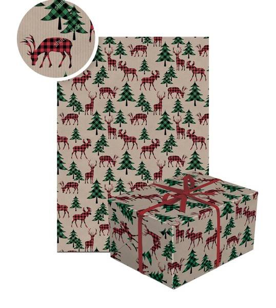 Papier do pakowania prezentów.Nadruk reniferów i choinek.Kolor dominujący: brązowy.Wymiary: 70x200 cm.