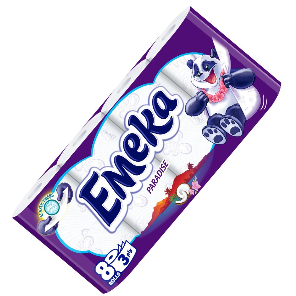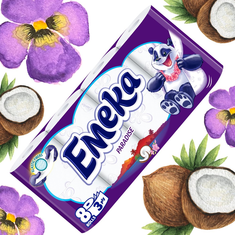 Miękki, wytrzymały, aromatyczny! Papier toaletowy PARADISE 8 rolek Emeka Emeka dla całej rodziny Linia produktów higienicznych Emeka zadowoli każdego połączeniem delikatnej miękkości, niezawodnej ...