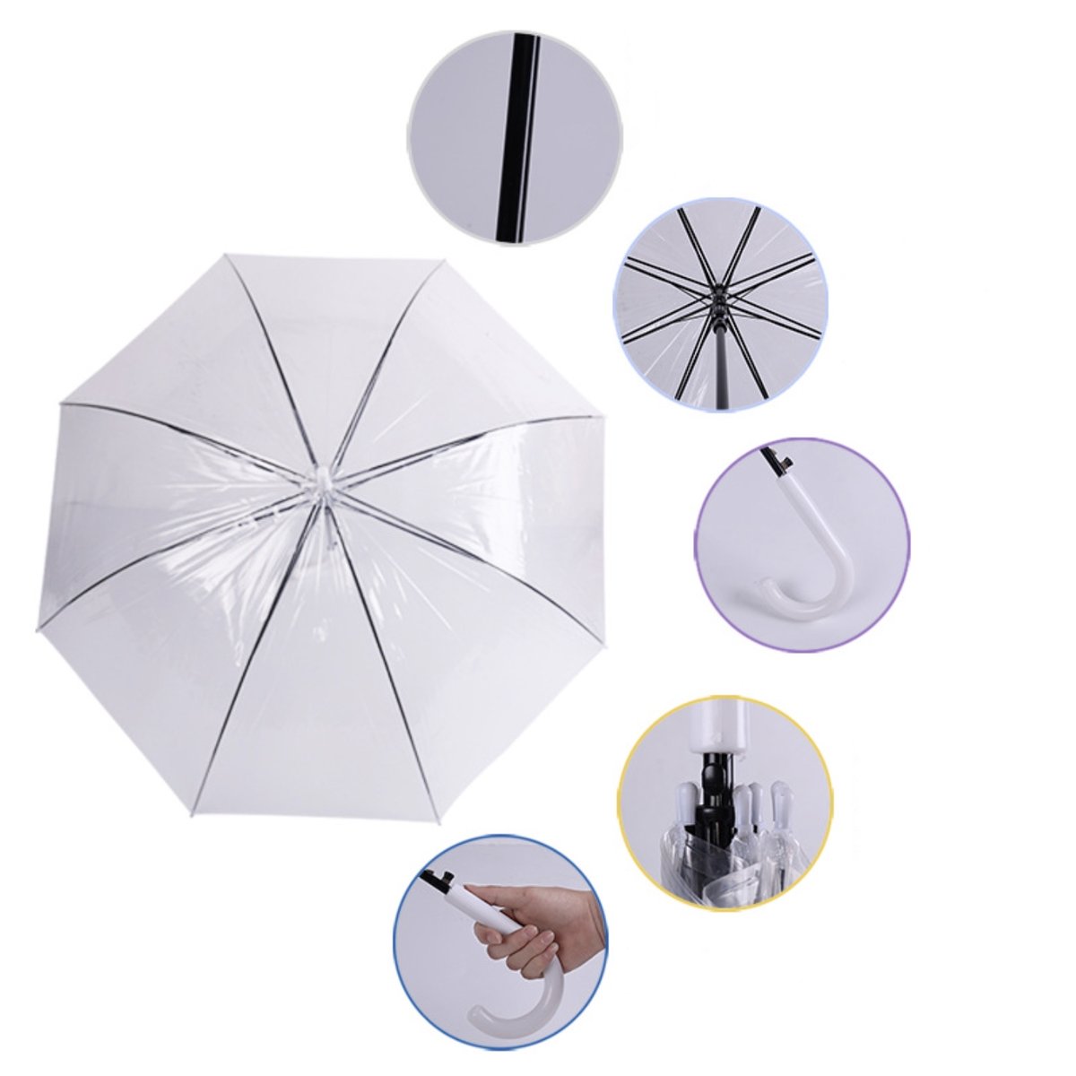 Przezroczysta parasolka sprawdzi się idealnie w wielu sytuacjach. Oprócz chronienia przed deszczem podczas codziennych wyjść, jej uniwersalny styl będzie również pasował idealnie do sesji fotograficznych, a także ochroni Cię w ważnym dniu ślubu, jednocześnie nie odwracając uwagi ani nie zasłaniając Pary Młodej!