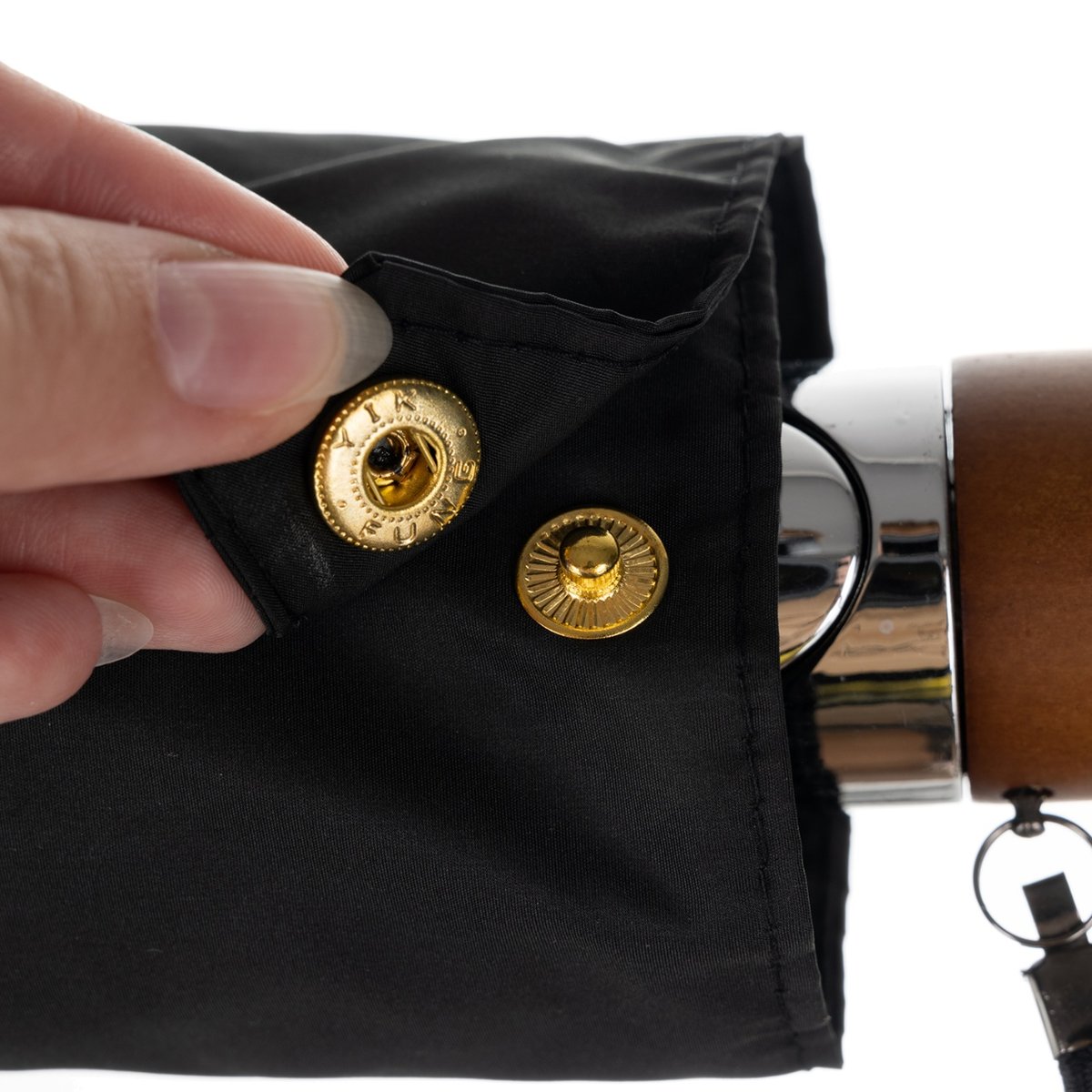 Tkaninę po złożeniu parasola zabezpieczysz zapinanym paskiem, chroni to przed przypadkowym rozłożeniem.
