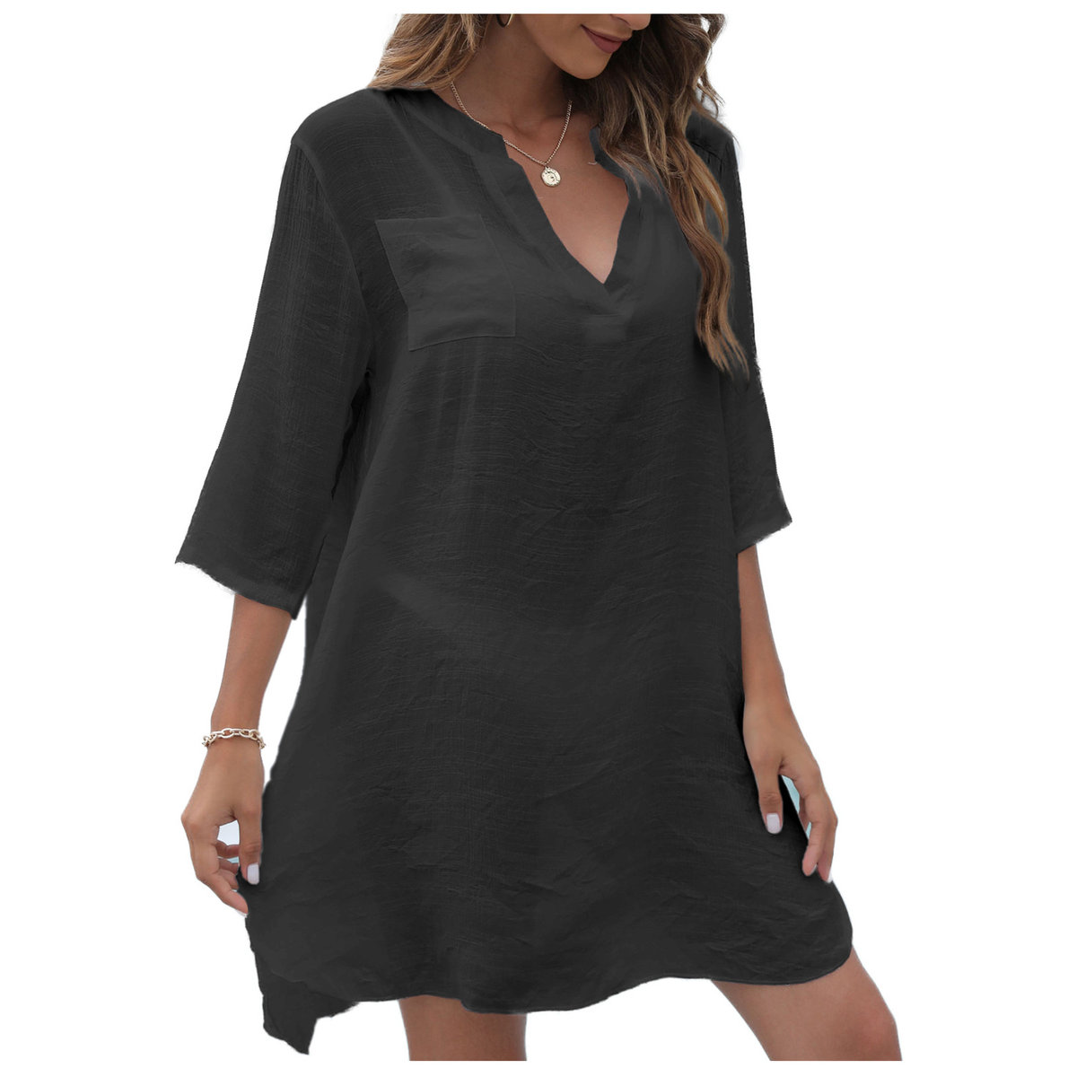 Wykonane z miękkiego, przewiewnego materiału, który delikatnie prześwituje i pozwala skórze oddychać. Luźny fason zapewnia komfort noszenia i pełną swobodę ruchów, a szerokie rękawy 3/4 zapinane na guziczek dodają mu stylu i wygody. Subtelne wycięcie przy dekolcie pięknie podkreśla linię szyi, nadając sylwetce lekkości.
