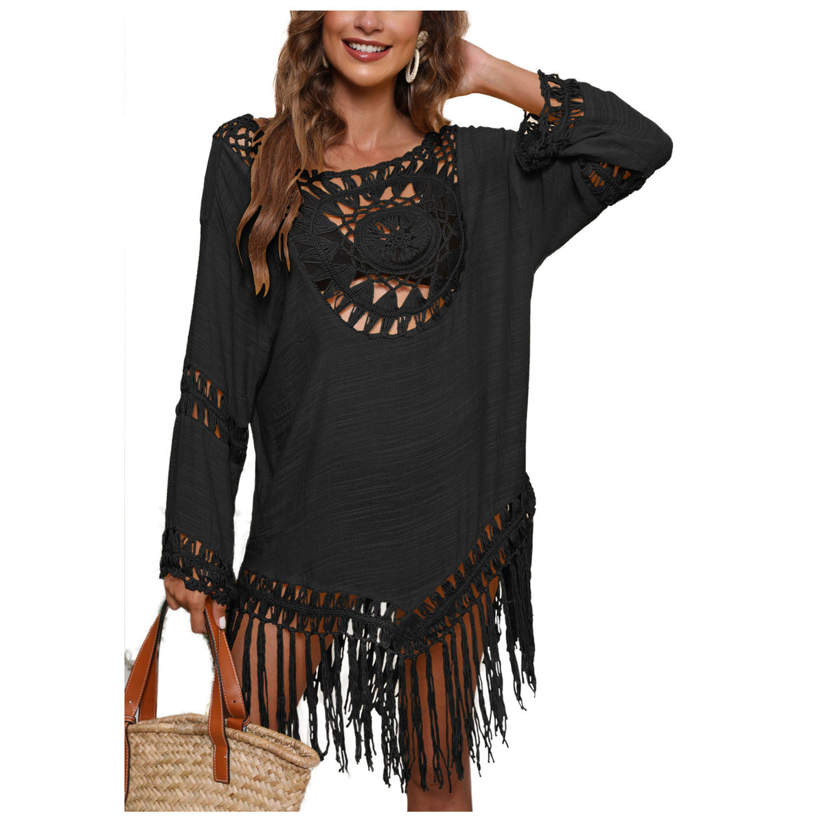Sukienka Plażowa Boho z Ażurowym Dekoltem i Frędzlami Odkryj magię boho stylu i wprowadź do swojej garderoby plażowej nutkę egzotyki oraz swobody dzięki naszej wyjątkowej sukience plażowej! Ta ...