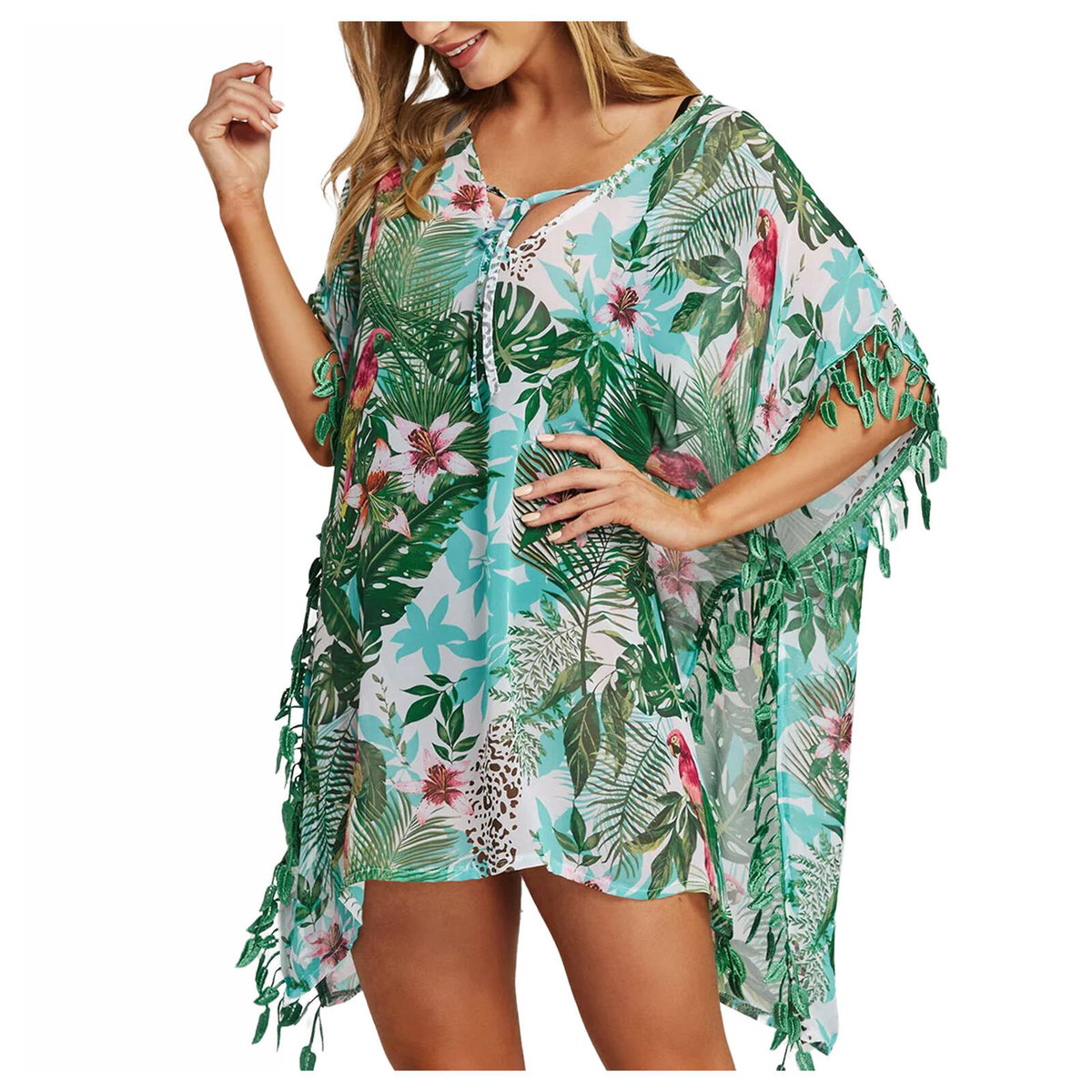 Charakterystyczne dla tego modelu są szerokie rękawy 3/4 oraz ozdobne frędzelki na rękawach i u dołu, które nadają całości lekkości i letniego charakteru. Tropikalny wzór przyciąga spojrzenia i doskonale współgra z atmosferą plażowego wypoczynku.