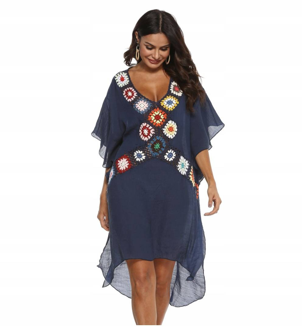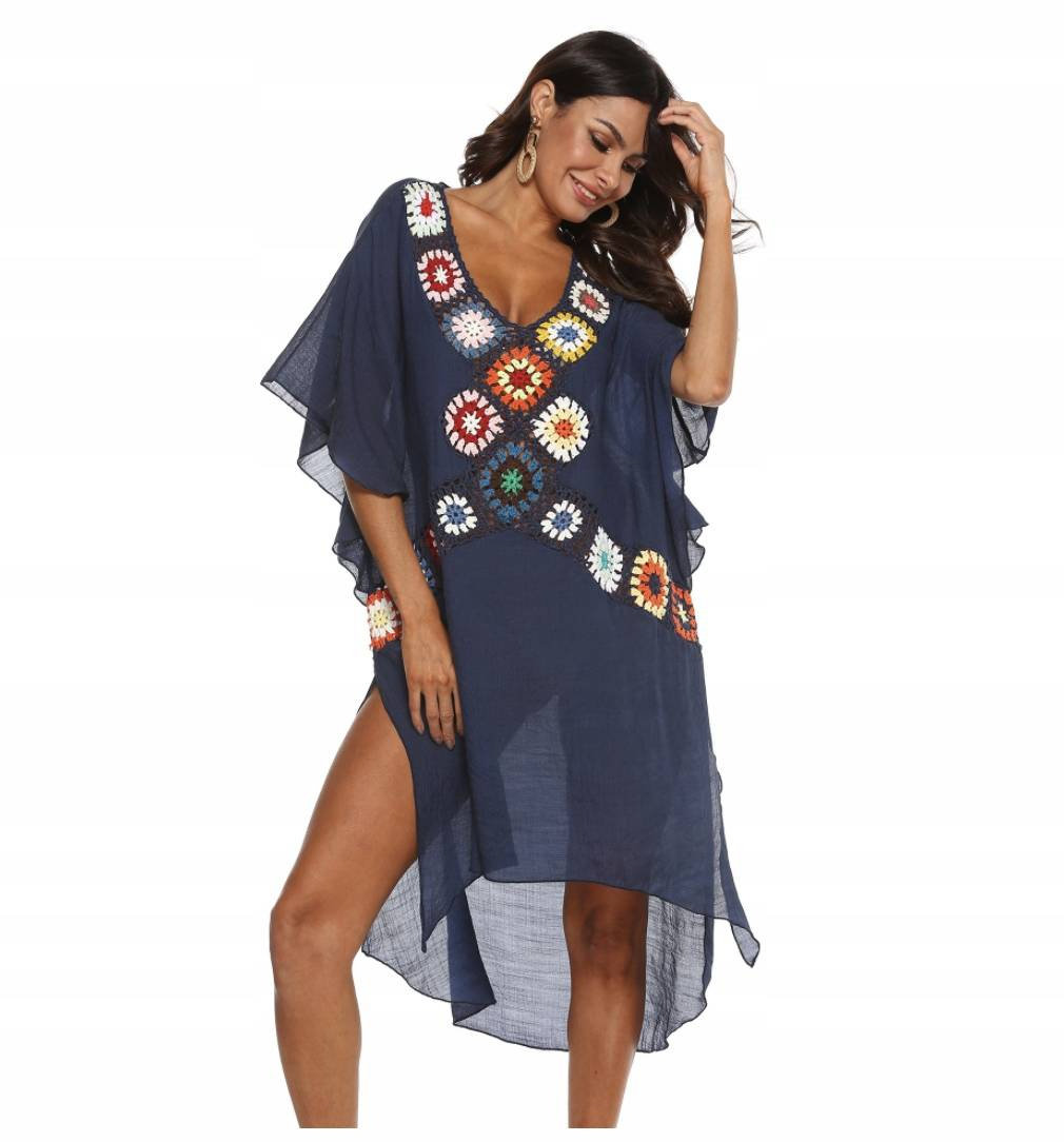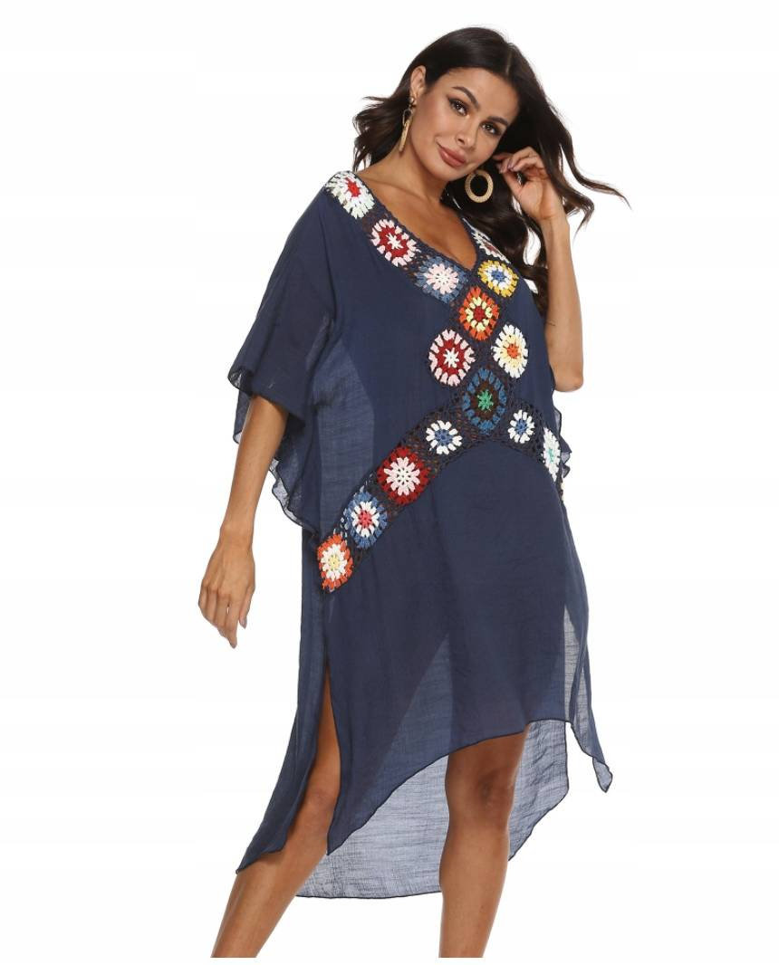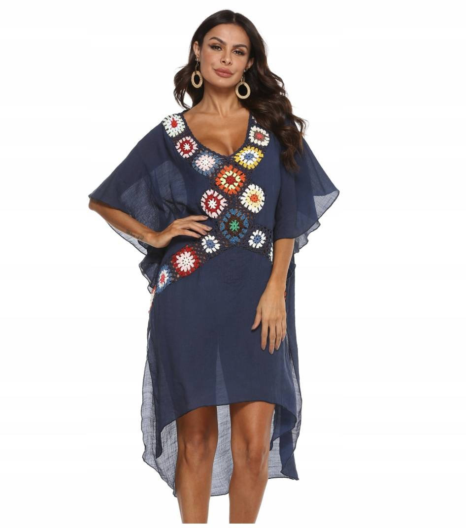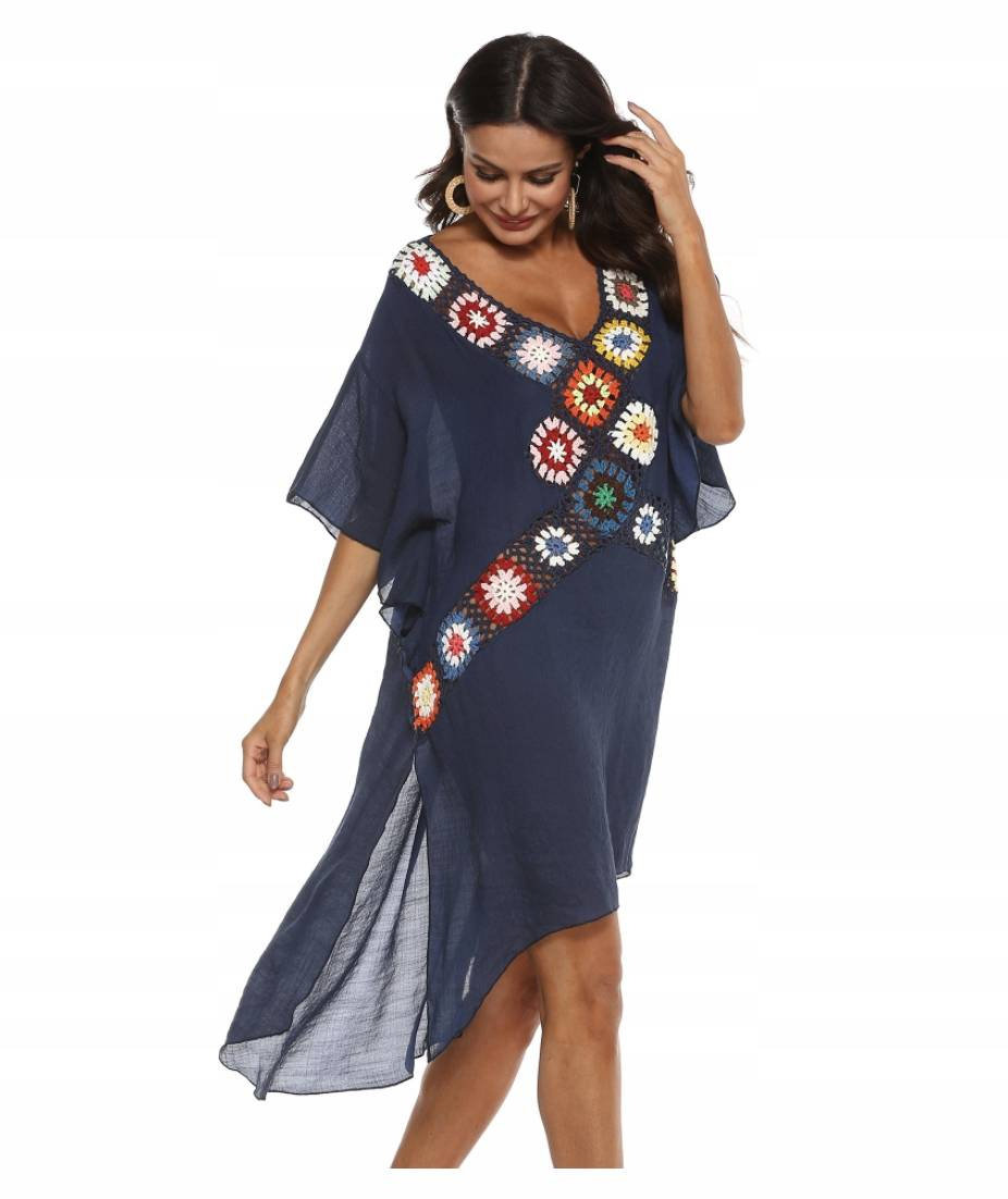 Charakterystyczne kolorowe, szydełkowe aplikacje w stylu boho umieszczone przy dekolcie i na bokach nadają tej narzutce wyjątkowego, rękodzielniczego uroku. Szerokie rękawy 3/4 oraz luźny, asymetryczny krój dodają lekkości, swobody i kobiecego wdzięku. To idealna propozycja jako narzutka na kostium kąpielowy lub lekka sukienka na plażę.