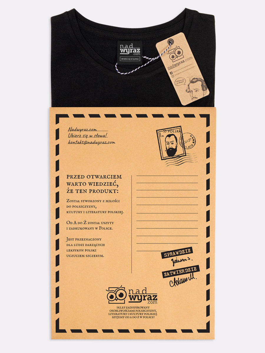Koszulka edukacyjna PARSZYWA 10 poleca się na prezent dla miłośnika polszczyzny, mistrza ortografii, językoznawcy, a także każdej osoby, która chciałaby już nigdy nie mieć wątpliwości, jaka jest poprawna pisownia „na razie”, „na co dzień”, „poszedłem”, „wziąć”, „poza tym”, „w ogóle”, „co najmniej”.