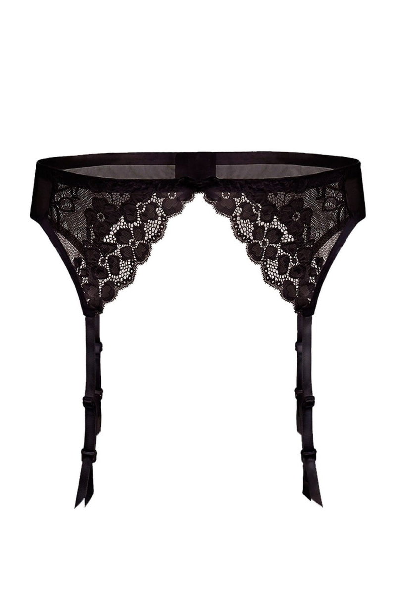 Czarny pas do pończoch z dużym kwiatowym motywem. Tył gładki zapinany na dwie haftki pozwala na idealne dopasowanie do sylwetki. Nieregularna koronka pięknie podkreśla biodra.