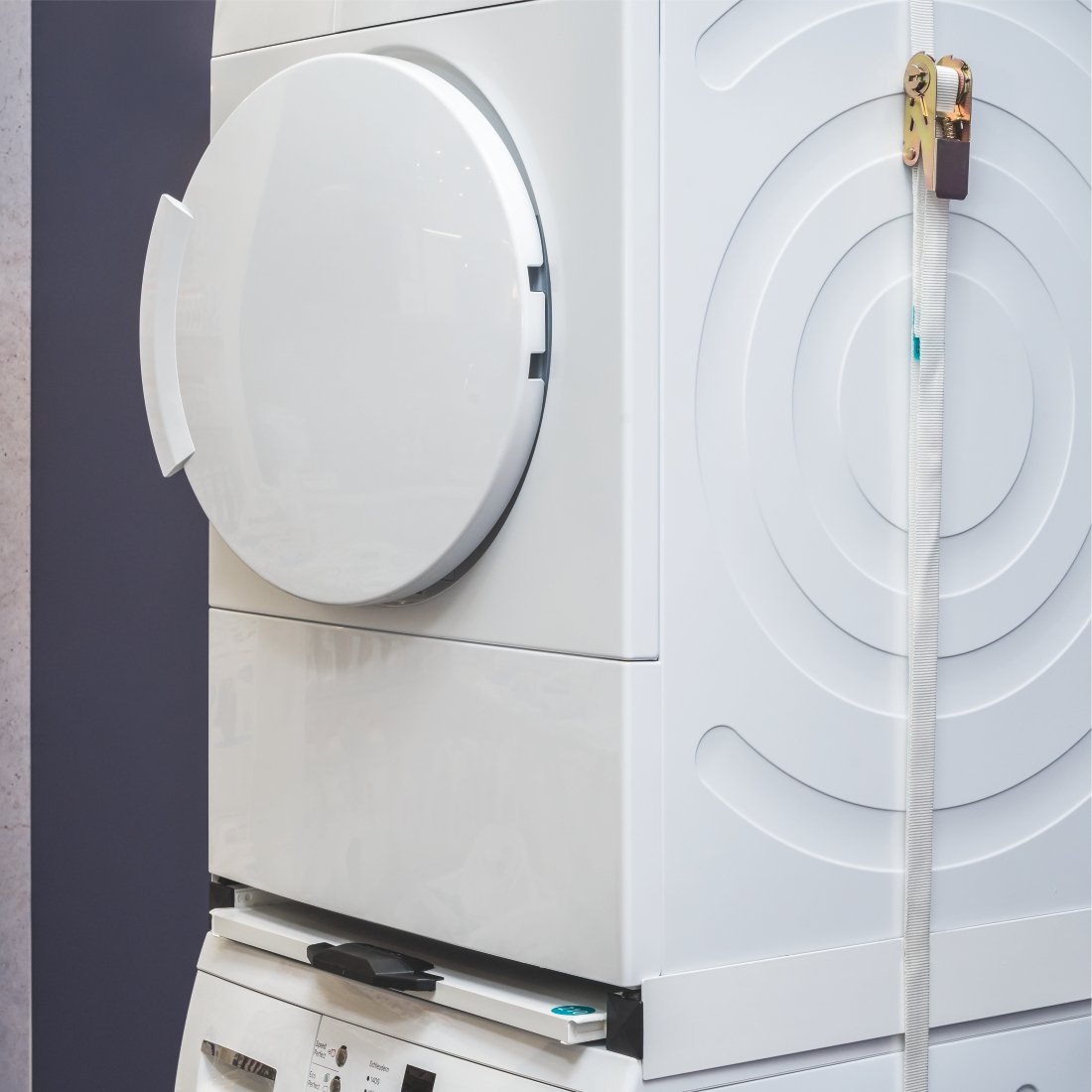 Ten pas to praktyczne rozwiązanie, które utrzymuje suszarkę bezpiecznie na pralce. Wystarczy owinąć go wokół obu urządzeń, przeciągnąć przez zapadkę i mocno zaciągnąć. Dzięki temu suszarka nie przesuwa się ani nie przewraca, nawet podczas intensywnego otwierania drzwi. To skuteczna ochrona przed niepożądanym ruchem, szczególnie w niewielkich łazienkach lub domach z dziećmi.