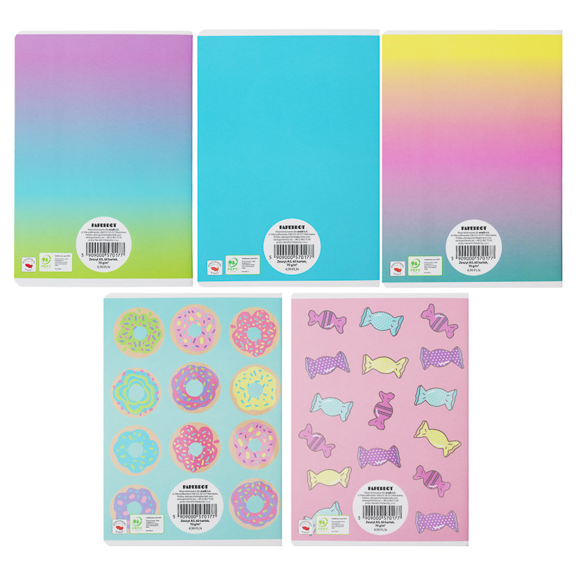 To prawdziwa uczta dla oka – pastelowe odcienie z efektem ombre przeniosą Cię do świata słodkich inspiracji. Motywy cukierków, lizaków, lodów i pączków dodadzą uroku każdemu przedmiotowi, zamieniając szkolną codzienność w kolorową przygodę!