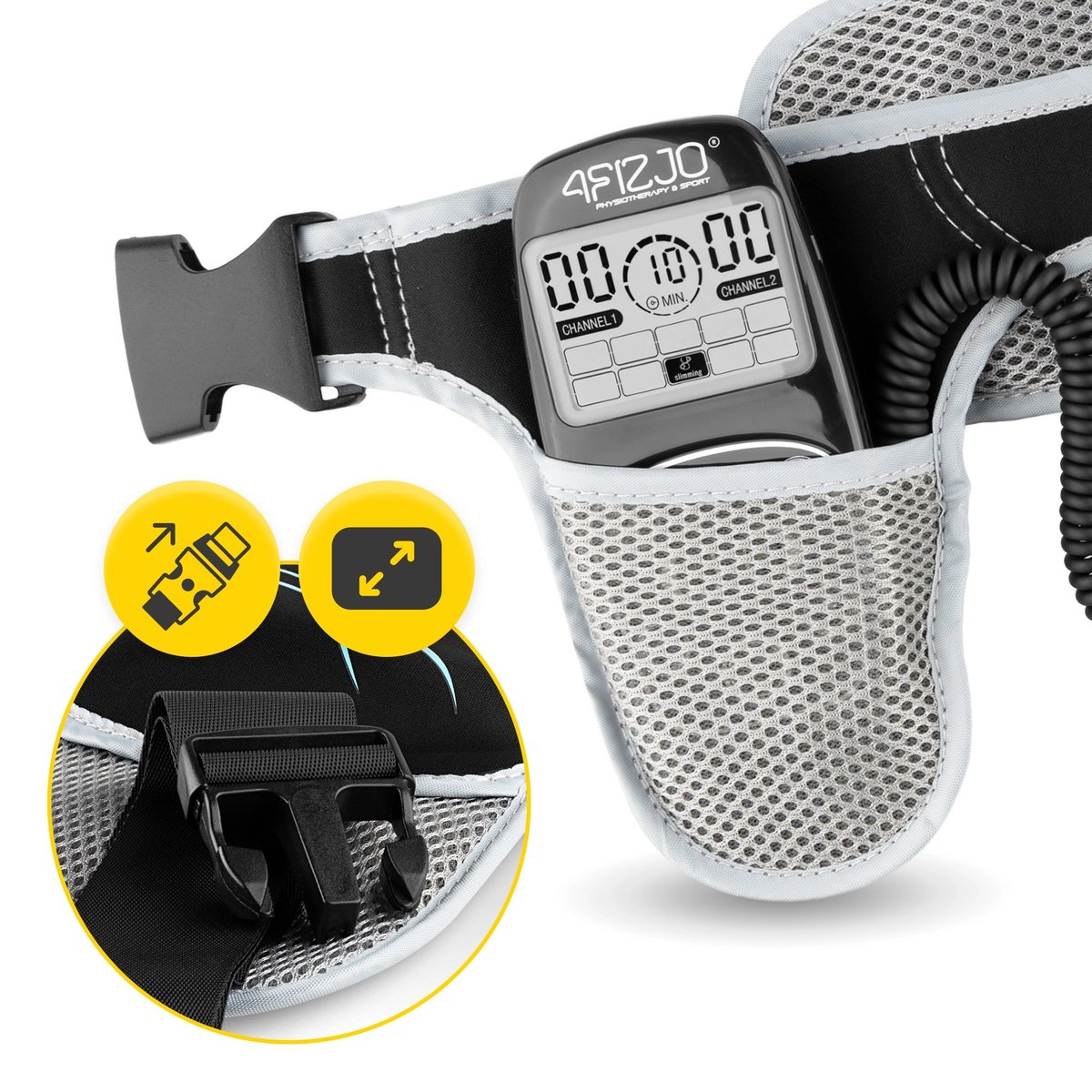 Elektryczne urządzenie do ćwiczeń mięśni brzucha 4FIZJO zostało zaprojektowane z myślą o wygodzie użytkowania i komfortowym treningu. Właśnie dlatego urządzenie to nie sprawia trudności z dopasowaniem do brzucha. Przy użyciu regulowanego paska z mocnym rzepem bez problemu dopasujesz masażer do obwodu swojego brzucha, ciesząc się udaną elektrostymulacją.