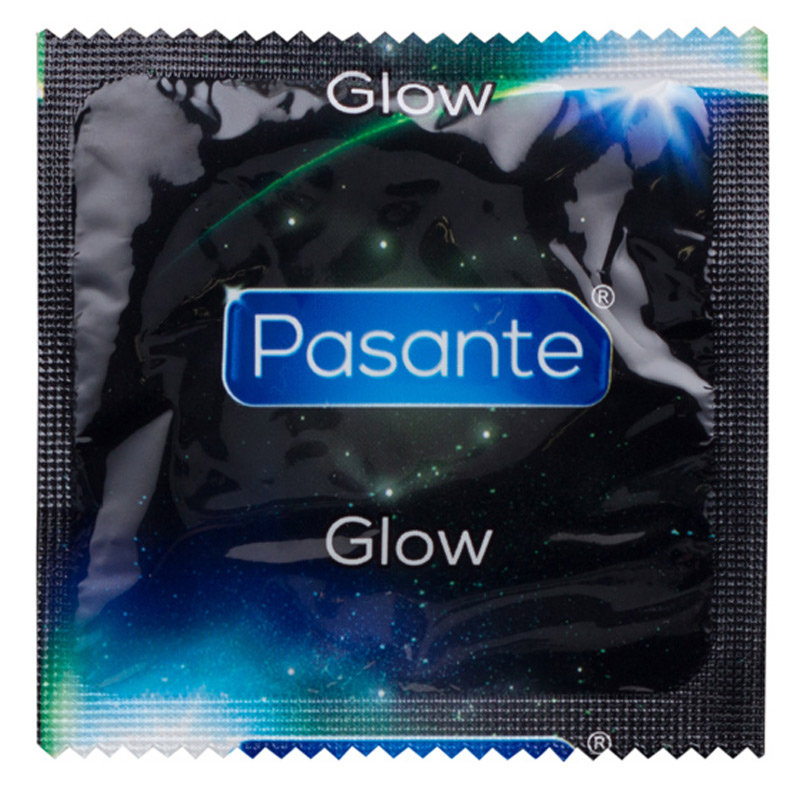 Pasante Glow to prezerwatywy o prostym kształcie, z dodatkiem wywołującym efekt fluorescencji! Wystarczy 30 sekund naświetlenia, aby cieszyć się ich długim świeceniem podczas stosunku, Dodatkowo są pokryte żelem nawilżającym.