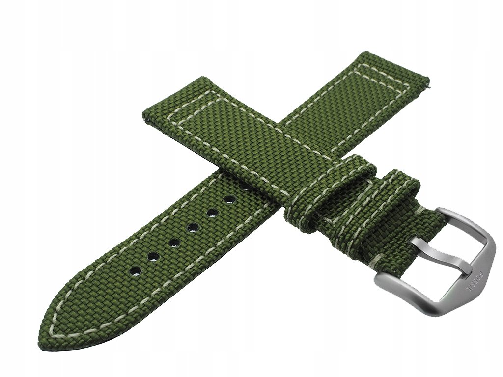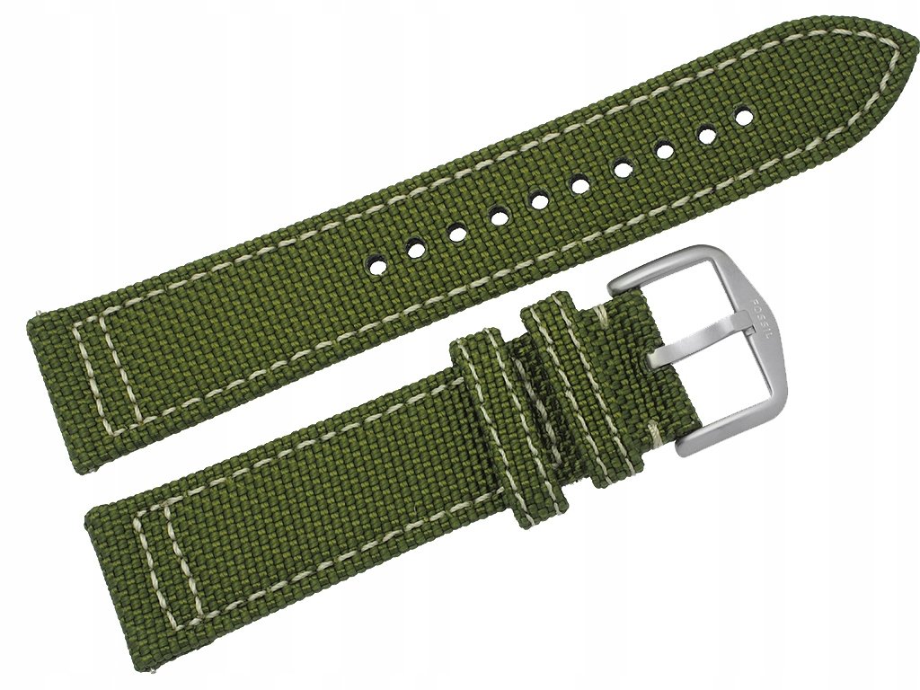 Oryginalny pasek do zegarka marki Fossil FS5918, materiałowo-skórzany, od spodu pasek w kolorze zielonym materiałowy, przeszycie jasne, od spodu pasek skórzany w kolorze czarnym, sprzączka wykonana ze stali nierdzewnej w kolorze srebrnym.