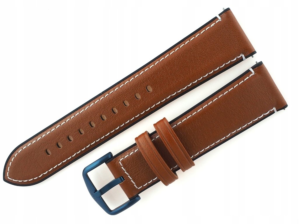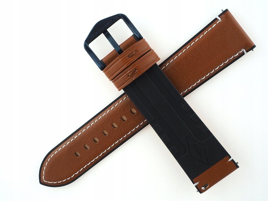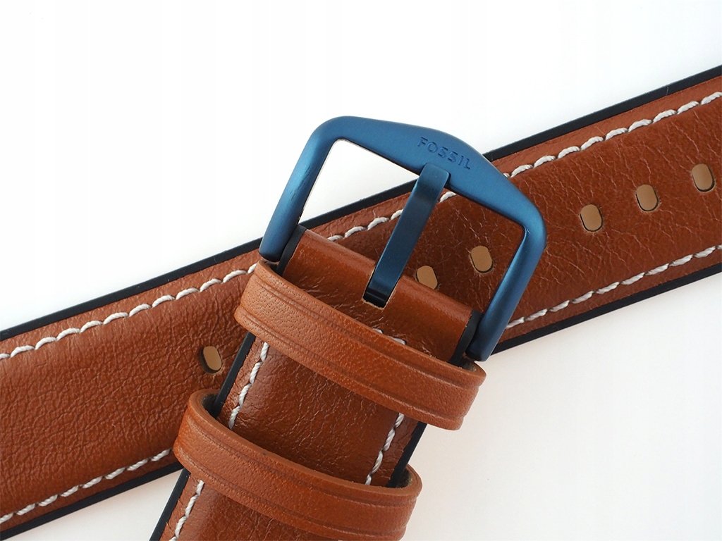 Oryginalny pasek do zegarka marki Fossil Q Explorist, wykonany ze skóry naturalnej w kolorze średni brąz, przeszyty jasną nicią, gładki, sprzączka wykonana ze stali nierdzewnej w kolorze niebieskim. Pasek od spodu wykonany z gumy w kolorze czarnym.
