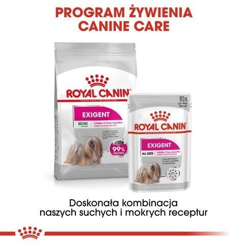 Karma ROYAL CANIN® Exigent Mini, dzięki wysokiej jakości białkom, tłuszczom, włóknu, witaminom i składnikom mineralnym, zaspokoi potrzeby organizmu Twojego psa i wpłynie na jego dobre samopoczucie.