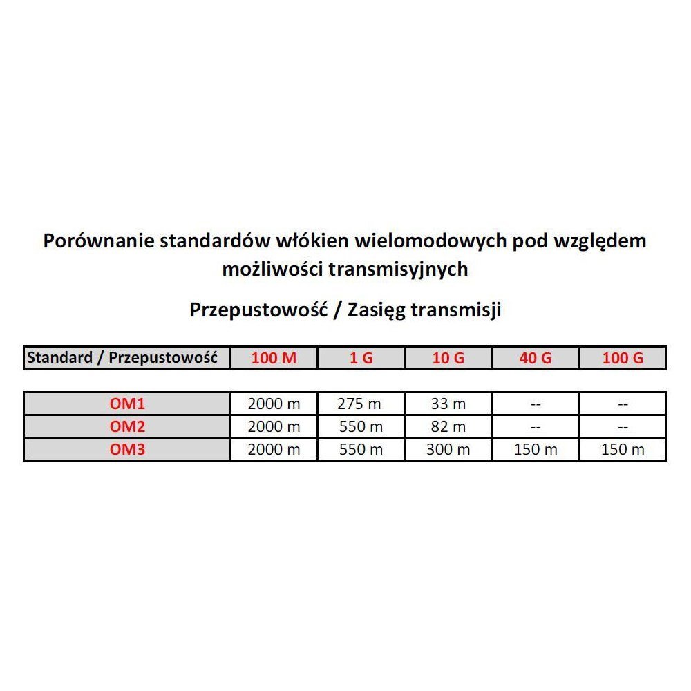 - OM3 50/125: przystosowany do transmisji z prędkością 10 Gigabit na odległość 300 m
