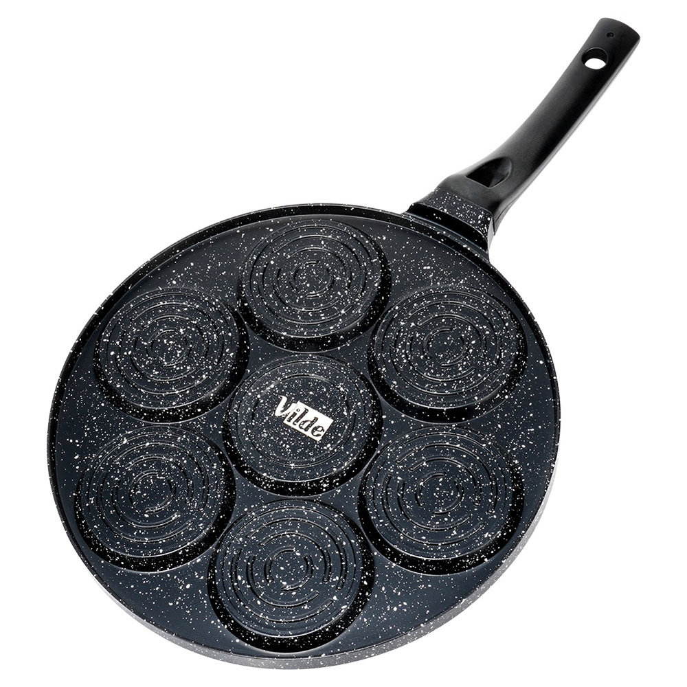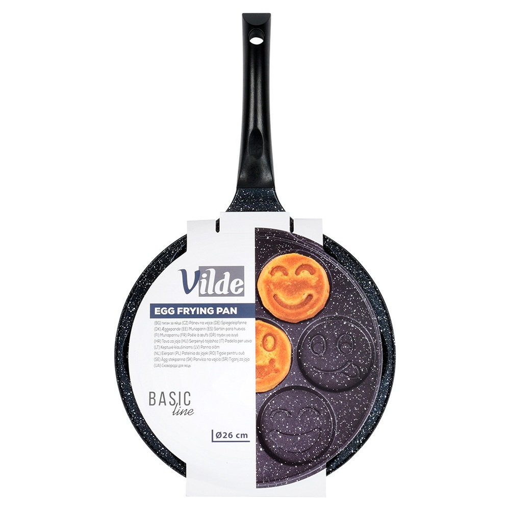 Nieprzywierająca patelnia do jajek o wyjątkowym, ponadczasowym wyglądzie. Patelnia utrzymana w modnym stylu, dzięki czemu efektownie prezentuje się w kuchni. Otwory pozwolą uzyskać okrągły kształt potraw. Z jej pomocą usmażymy pyszne jajka sadzone, ulubione placuszki śniadaniowe czy mini naleśniki. Wykonana z najwyższej jakości materiałów, odpowiednio użytkowana posłuży długie lata. Oryginalny produkt marki Vilde z linii Basic Line. Wyprodukowano zgodnie z europejskimi standardami.