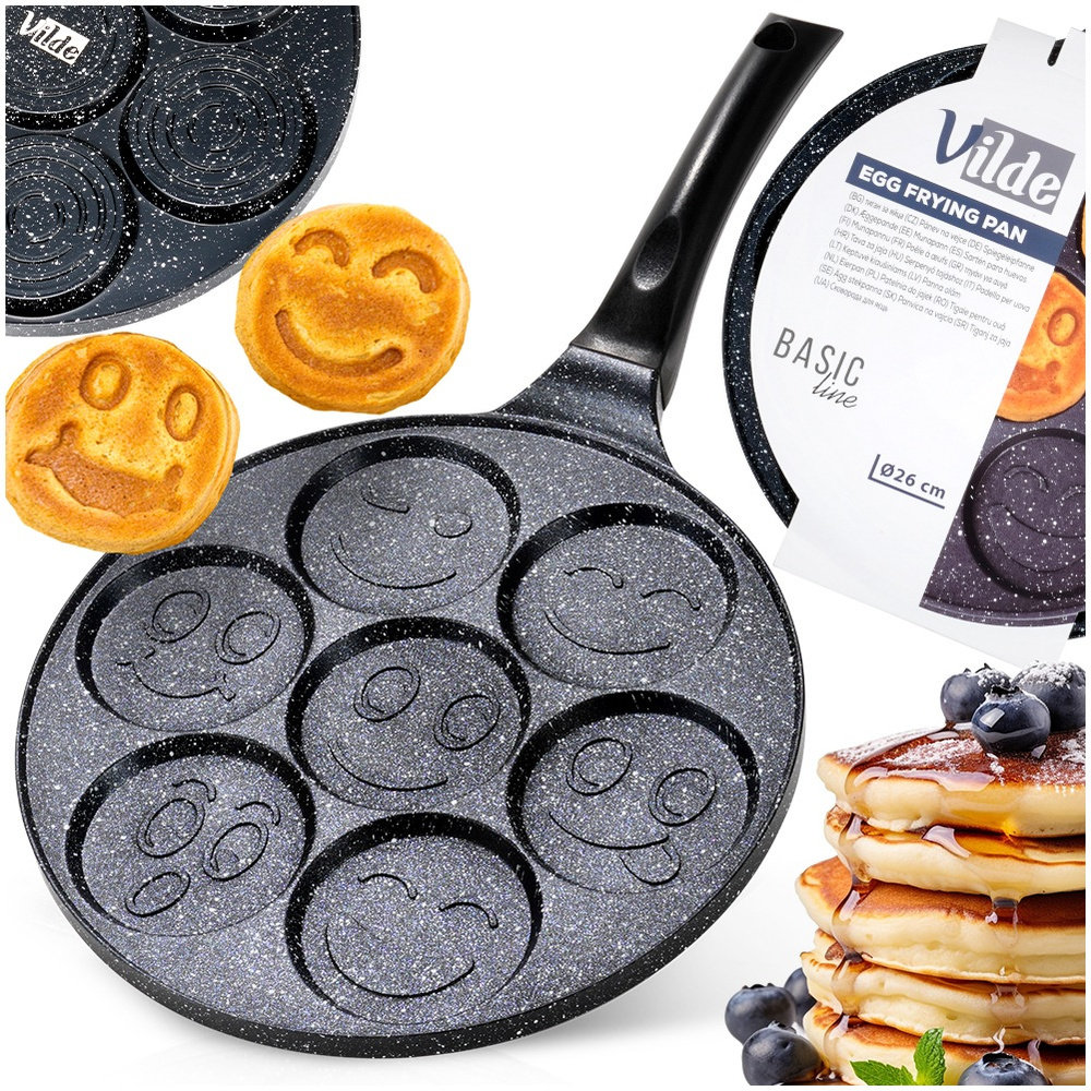 ✅ Praktyczna patelnia do jajek - Patelnia idealna do przygotowywania jajek sadzonych i placuszków. Patelnia z linii Basic line o średnicy 26 cm z siedmioma dedykowanymi otworami o średnicy 8 cm, pozwala uzyskać perfekcyjny kształt potraw. Otwory posiadają efektowne tłoczenia na dnie w kształcie różnych, uśmiechniętych buziek. Wymiary zewnętrzne: długość 46 cm, wysokość patelni 1,5 cm, wysokość z rączką 6 cm.