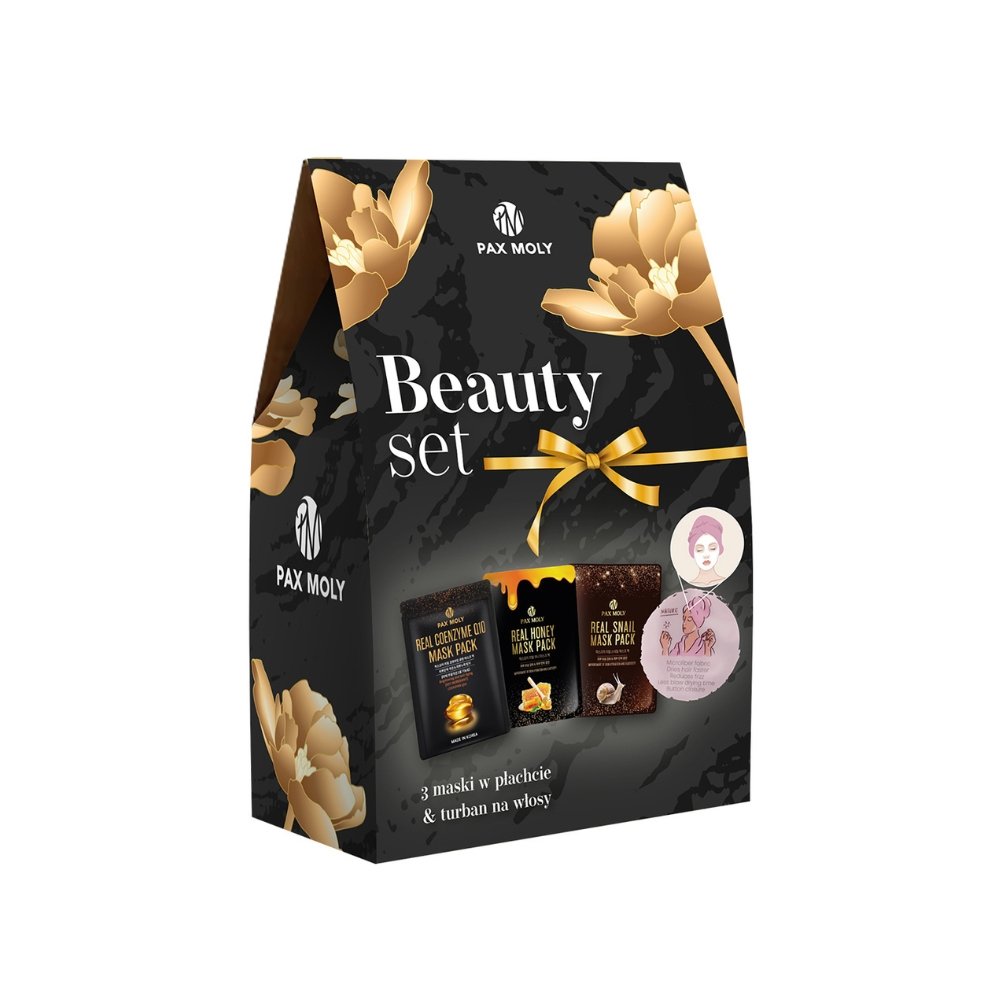 Zestaw PAX MOLY to idealne rozwiązanie dla osób pragnących kompleksowej pielęgnacji skóry twarzy i komfortu dla włosów. Zawiera 3 różnorodne maseczki w płachcie – Real Coenzyme Q10, Real Honey Mask oraz Real Snail Mask, które skutecznie nawilżają, odżywiają i regenerują skórę. Dodatkowo do zestawu dołączony jest turban do włosów marki Echolux, wykonany z mikrofibry, który zapewnia wygodę podczas stosowania maseczek.