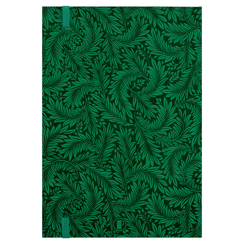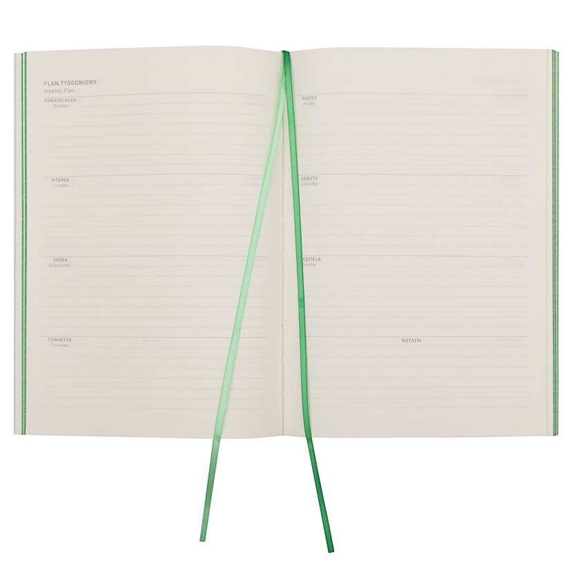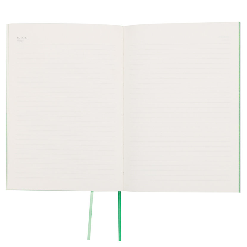 Twarda zileona okładka z wytłoczonym wzorem gałązek nadaje notesowi delikatny, naturalny charakter, a zielona gumka pełni funkcję praktycznego zapięcia, zabezpieczając wnętrze. Dodatkowo w środku znajduje się tasiemka, ułatwiająca zaznaczanie wybranych stron. Format A5 (148 × 210 mm) sprawia, że notes jest wygodny w codziennym użytkowaniu – idealny do pracy, nauki czy zapisywania pomysłów.