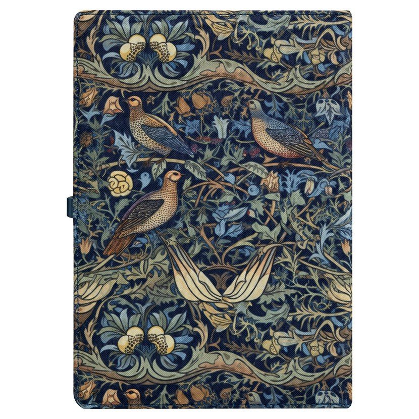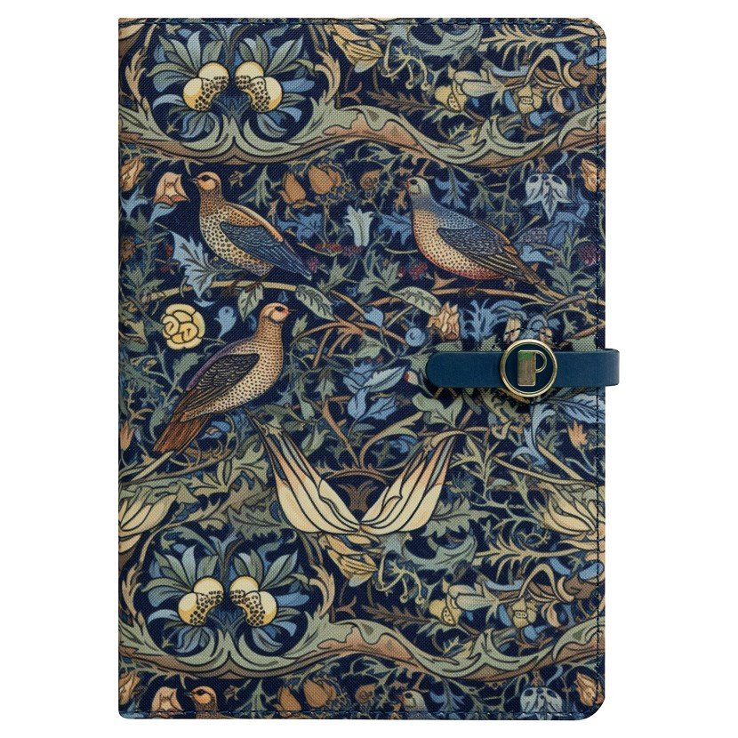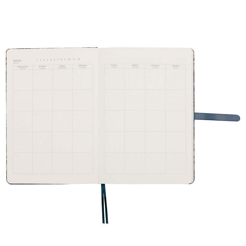 Twarda okładka z roślinnym wzorem z delikatnymi ptakami utrzymana jest w stonowanych odcieniach granatu, zieleni i beżu, co nadaje całości spokojny i harmonijny wygląd. Granatowe zapięcie z pozłacaną klamerką dodaje subtelnego akcentu oraz chroni wnętrze planera. Format A5 sprawia, że planer jest poręczny i wygodny w codziennym użytkowaniu – doskonale sprawdzi się w pracy, w domu i w podróży.