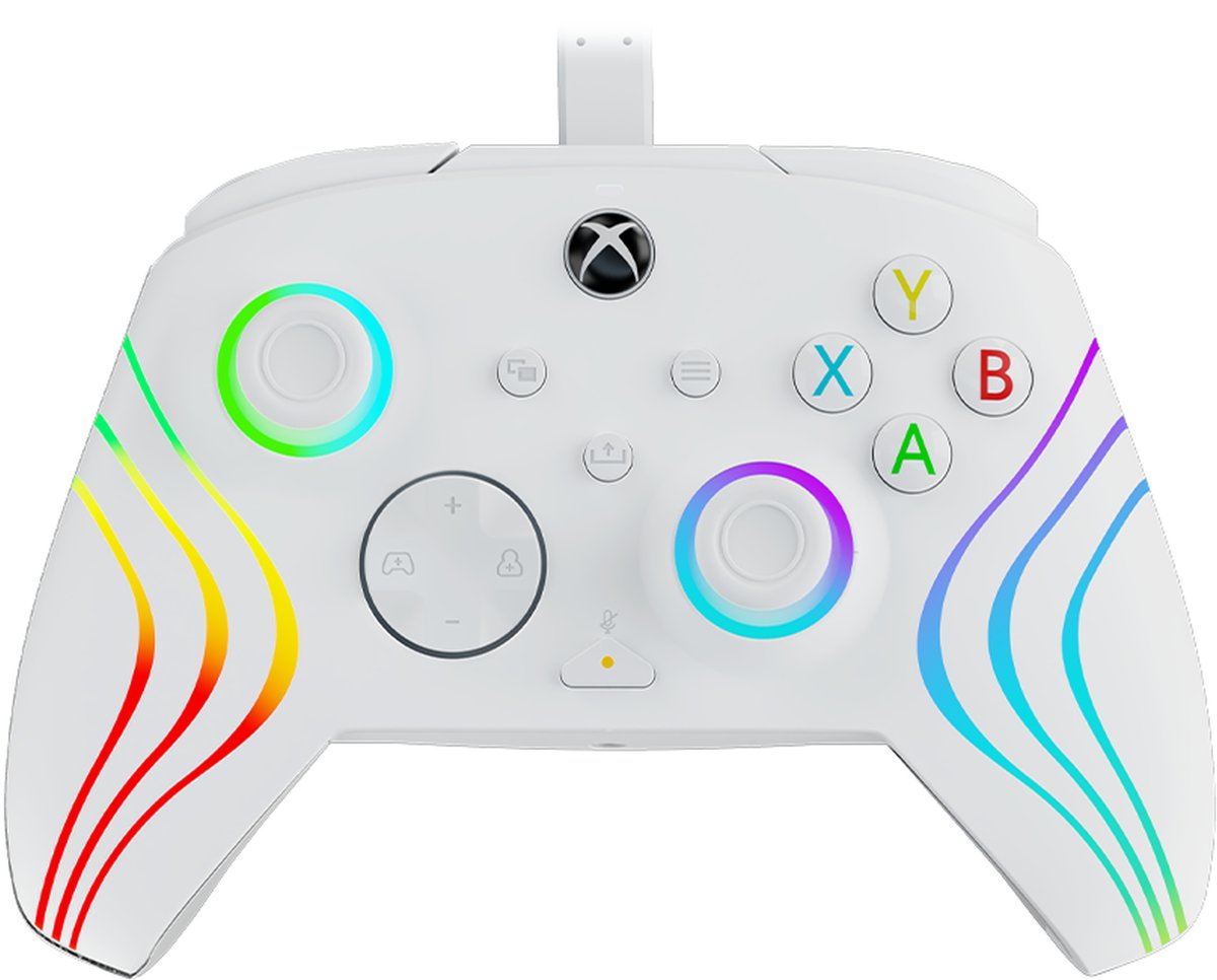 Rzuć na swój zestaw gamingowy nowe światło za sprawą kontrolera przewodowego Black Afterglow Wave na konsolę Xbox! Ten oficjalnie licencjonowany kontroler pozwala personalizować rozgrywkę, tworzyć kolorowe efekty i dużo więcej. Wywołaj fale wielu barw i kombinacji kolorystycznych, konfigurując światła RGB i ustawienia kontrolera przewodowego Afterglow Wave. Zmieniaj efekty świetlne i kolory przyciskiem „funkcyjnym” lub pobierz aplikację PDP Control Hub, żeby dostosować osiem stref oświetlenia RGB i nie tylko. Dodatkowo spersonalizuj kontroler w aplikacji, korzystając z niezliczonych funkcji, takich jak ponowne mapowanie przycisków, powtórna konfiguracja wyzwalaczy czy ustalanie martwych stref. Szybko i efektywnie wykonuj operacje, mapując funkcje kontrolera do dwóch programowalnych przycisków tylnych. Używaj wbudowanych przycisków sterowania głośnością na d-padzie oraz szybkiego wyciszenia mikrofonu i błyskawicznie zmieniaj poziom ustawień, nie tracąc przy tym przyjemności z gry. Popraw precyzję i podaruj sobie całodniowy komfort dzięki teksturowanym gripom i wyzwalaczom pada. Wepnij dołączony 2,5-metrowy przewód USB-C i pokaż swoje prawdziwe kolorystyczne oblicze.