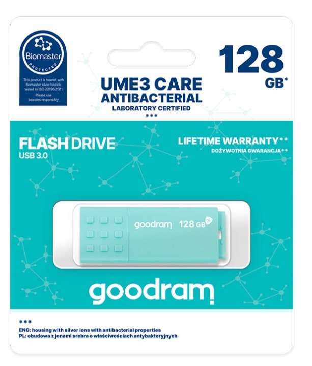 USB 3.0 UME3 CARE Pendrive GOODRAM 128GB UME3 CARE USB 3.0 Pojemność: 128 GB Dostępne kolor: Miętowy - zielony Obudowa o właściwościach antybakteryjnych Zastosowanie jonów srebra w o ...