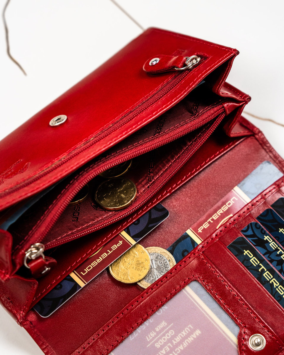 | Nazwa: | PETERSON Skórzany portfel damski średni czerwony zestaw prezentowy z brelokiem do kluczy antykradzieżowy ochrona RFID |