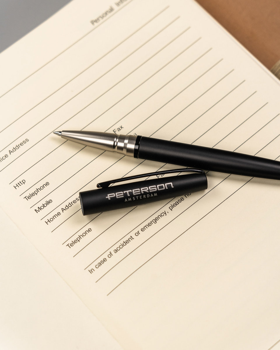 Do zestawu dołączono elegancki czarny długopis marki PETERSON, który idealnie komponuje się z organizerem. Jego smukła, minimalistyczna obudowa sprawia, że doskonale leży w dłoni, a płynne pisanie o grubości linii 0,7 mm gwarantuje komfort użytkowania. Długopis wyposażony jest w wymienny wkład, dzięki czemu służy przez długi czas. To narzędzie, które nie tylko pisze – ono wyraża styl.