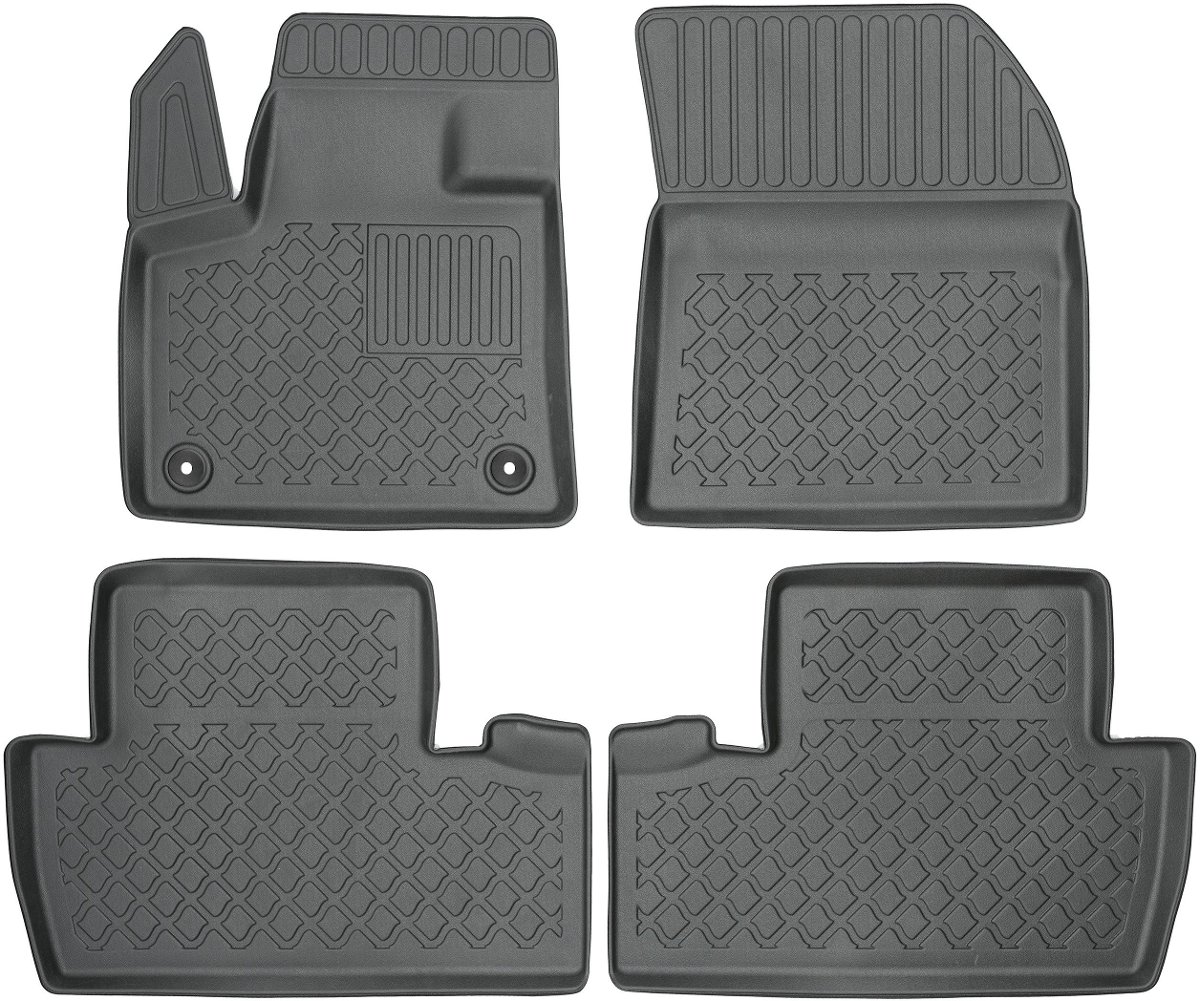 Oferowane dywaniki zostały precyzyjnie zaprojektowane do kształtu płyty podłogowej biorąc pod uwagę nie tylko markę / model samochodu, ale także rocznik oraz wersję nadwozia, dzięki czemu pasują idealnie. Dywaniki wytwarzane są z najwyższej jakości, trwałego i wzmocnionego tworzywa sztucznego, niezawierającego substancji szkodliwych dla zdrowia, co zapewnia bezpieczeństwo użytkowania. Wysoki kołnierz (brzeg) ochronny dookoła dywaników oraz stabilność kształtu skutecznie zatrzymuje wodę i brud, zabezpieczając oryginalną tapicerkę samochodową przed zabrudzeniem. Bezpieczne w użytkowaniu, dzięki praktycznemu i łatwemu w użyciu systemowi mocowania do podłogi samochodu. System mocowania dostosowany jest do marki / modelu samochodu i zabezpiecza dywanik przed przesuwaniem podczas jazdy. Matowe wykończenie oraz dopracowany wzór na powierzchni zapewniają estetyczny wygląd dywaników w samochodzie.