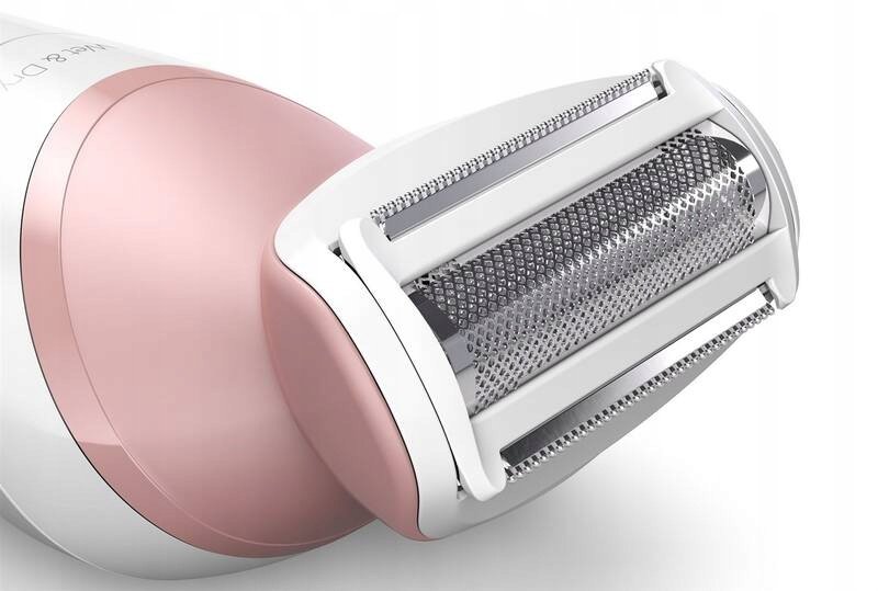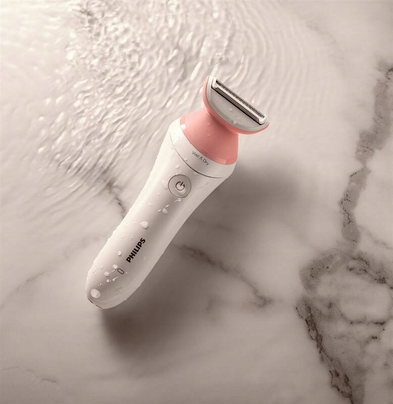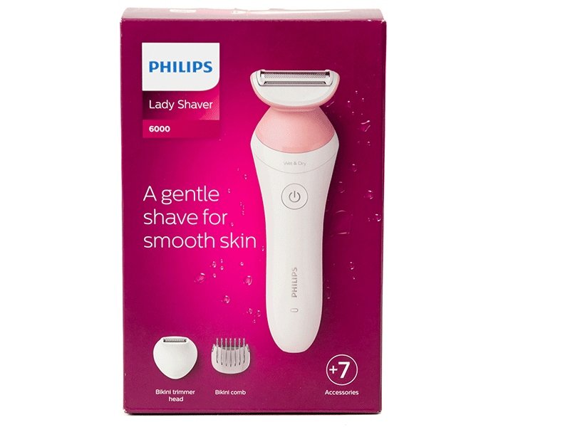 Zestaw zawiera 1 x Philips Lady Shaver Series 6000, 6 x akcesoriów, w tym 1 x rękawica do peelingu ciała, 1 x nasadka i grzebień do strefy bikini oraz 1 x szczotka do czyszczenia