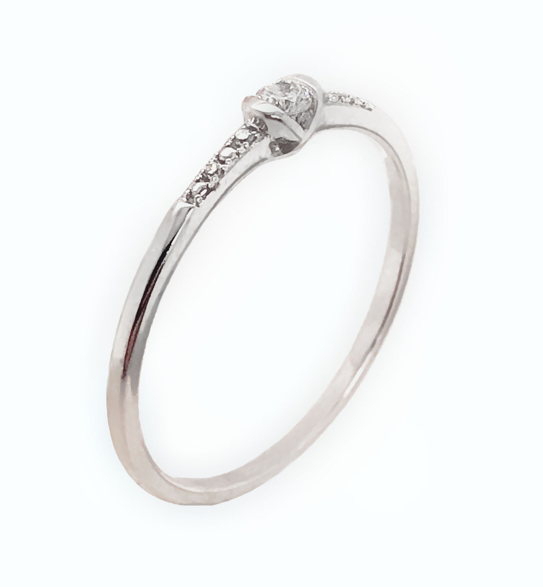 Pierścionek wykonany z białego złota o próbie 585 (14 Karat), ozdobiony brylantem o masie 0,06ct czystości SI, barwie H.