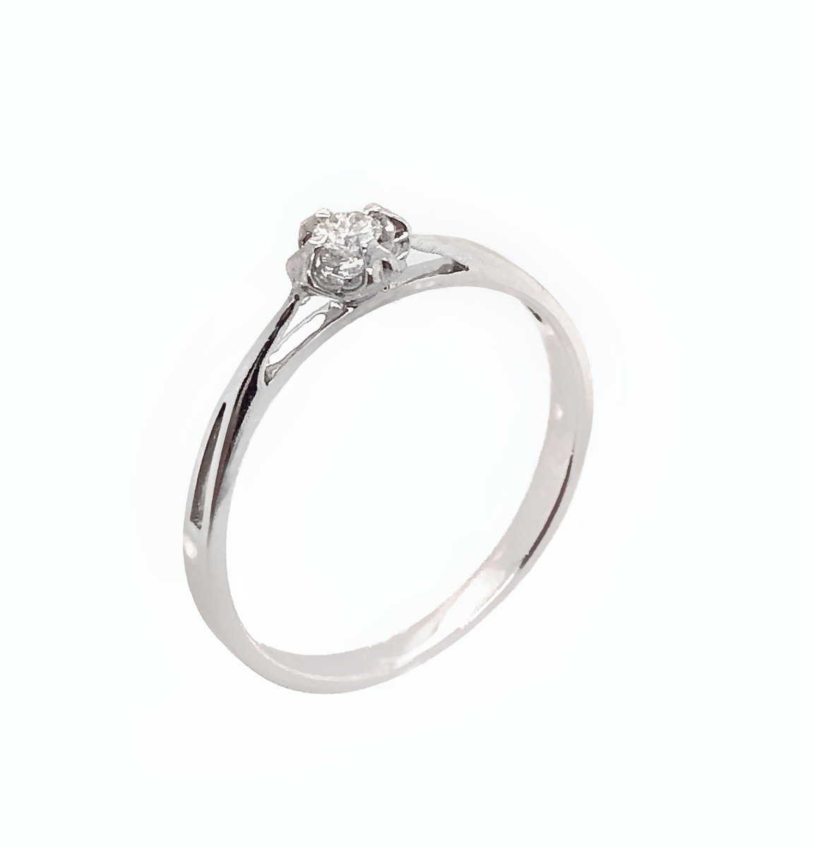 Pierścionek wykonany z białego złota o próbie 585 (14 Karat), ozdobiony brylantem o masie 0,07ct czystości SI, barwie H.